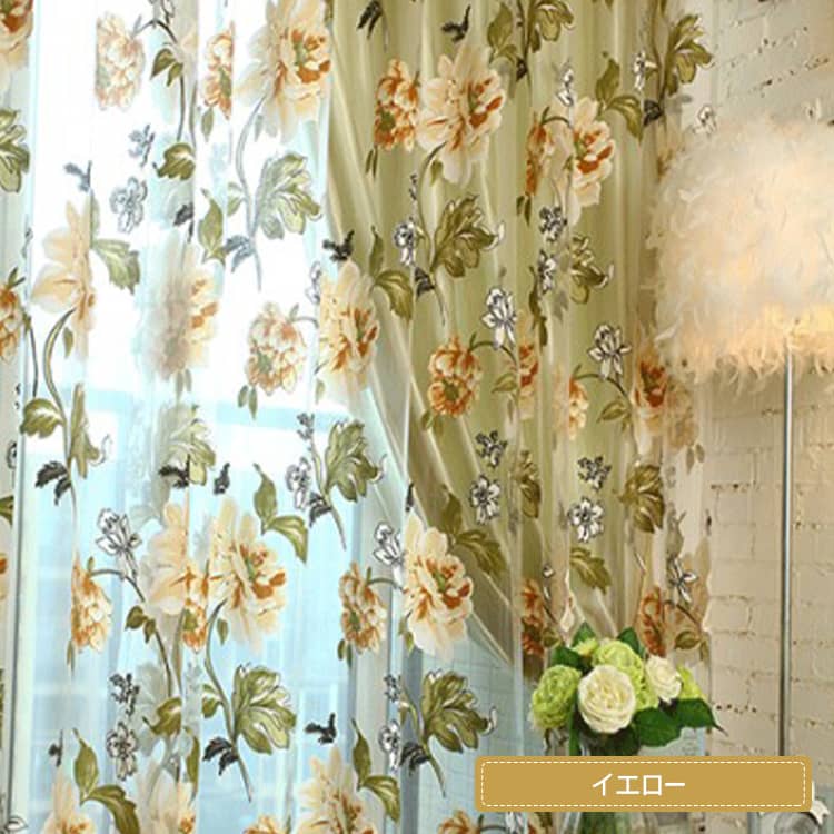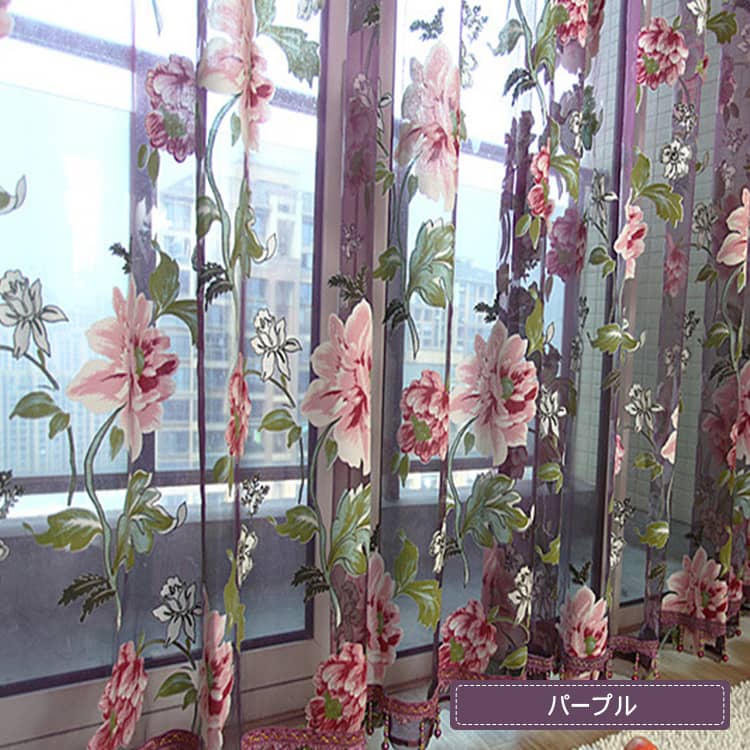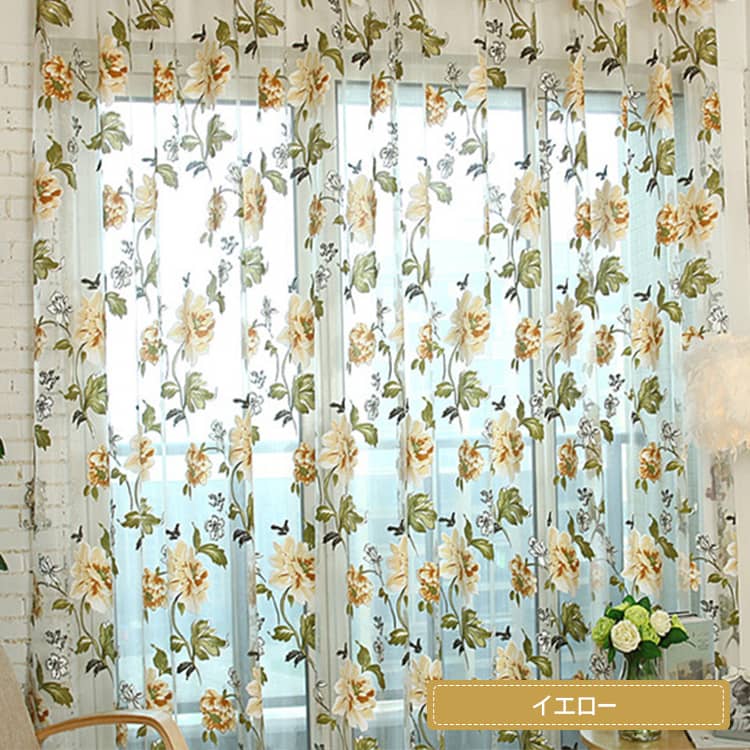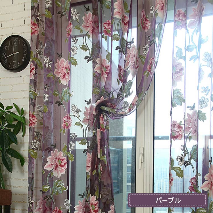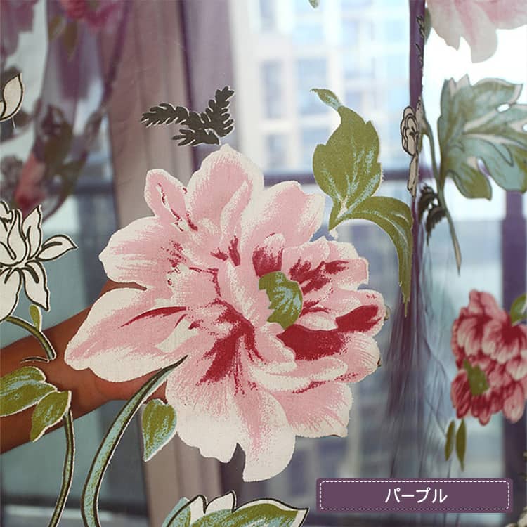 鮮やかな色合いでプリントされた、ボタンの花をモチーフとしたオパールレースカーテン。