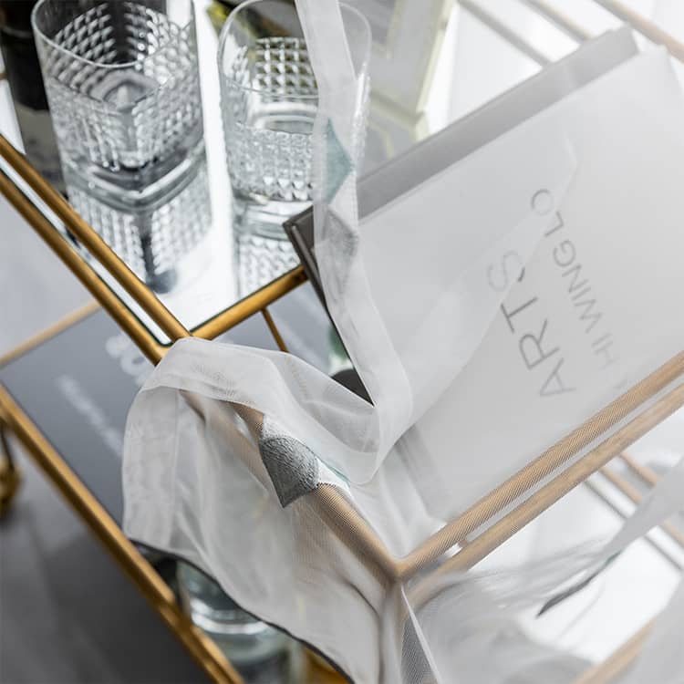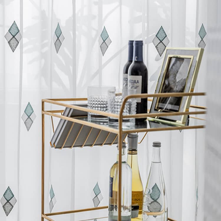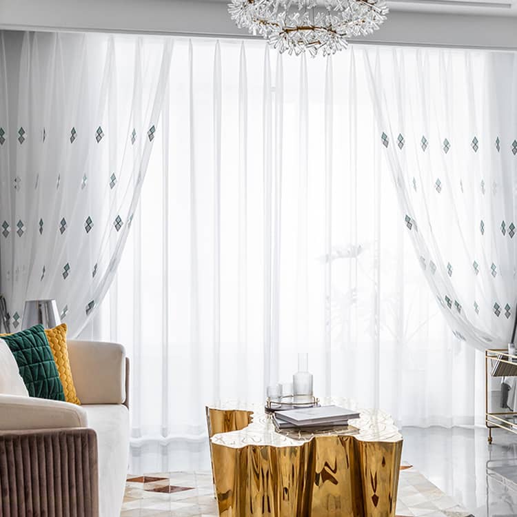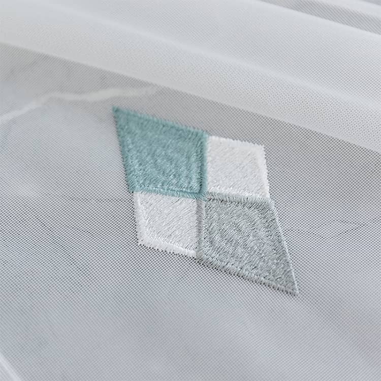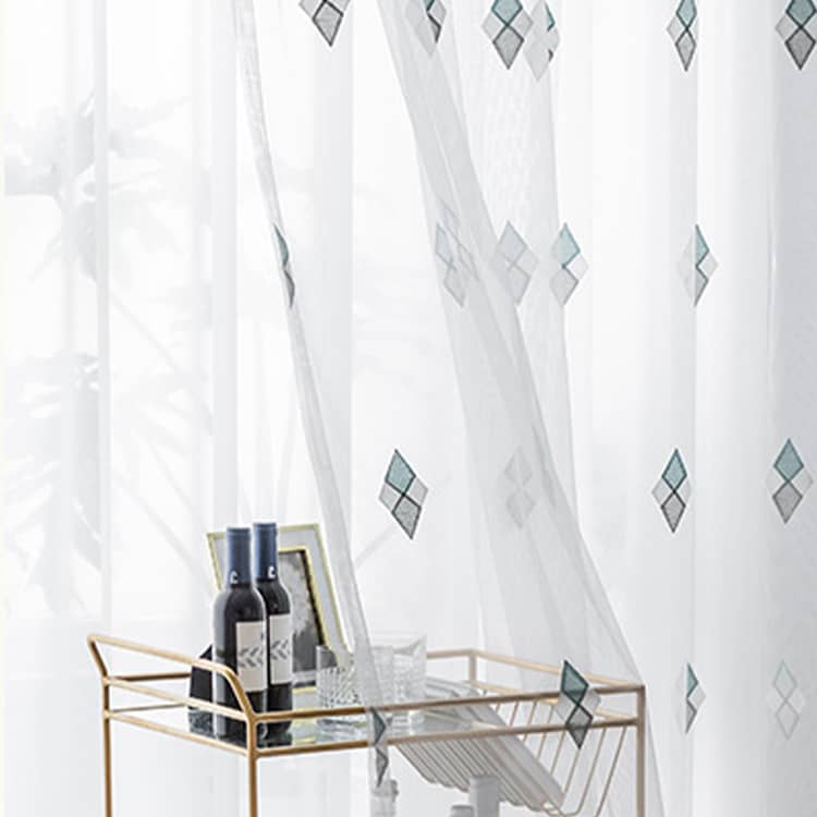 簡潔な菱形チェックの糸刺繍を施されたレースカーテン。
