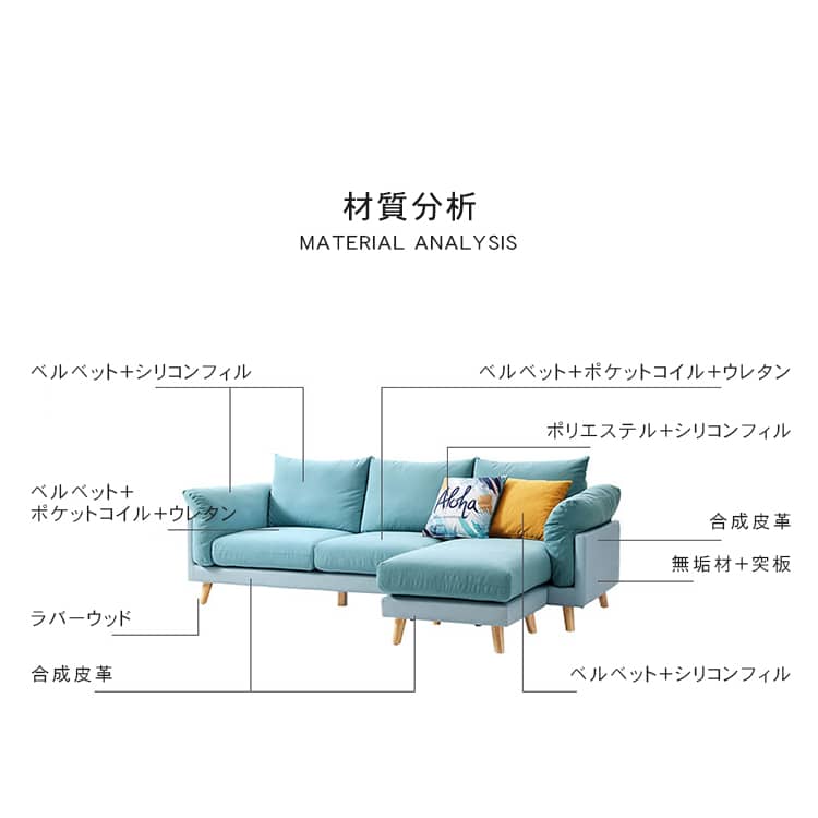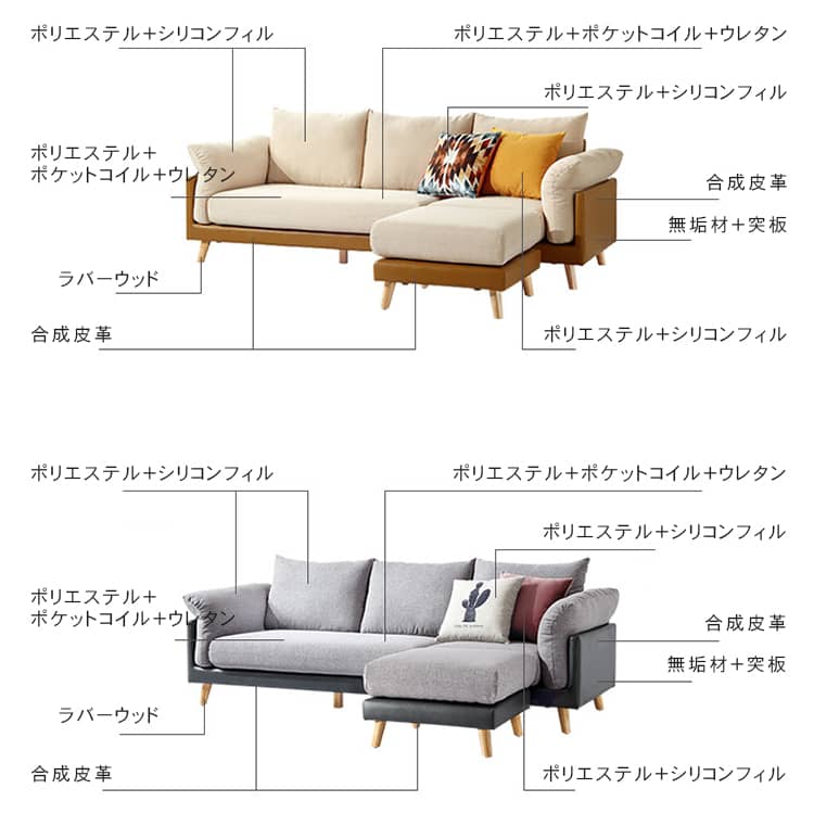 ポリエステル、ウレタン、合皮、ベルベッド、ラバーウッド、ポケットコイルスプリング |