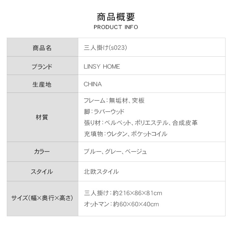 216*86*81cm(三人掛け) 60*60*40cm(オットマン) |