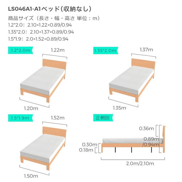 | サイズ | 210*122*89/94cm(ベッド) 210*137*89/94cm(ベッド) 200*152*89/94cm(ベッド) 40*35*50cm(ナイトテーブル) |