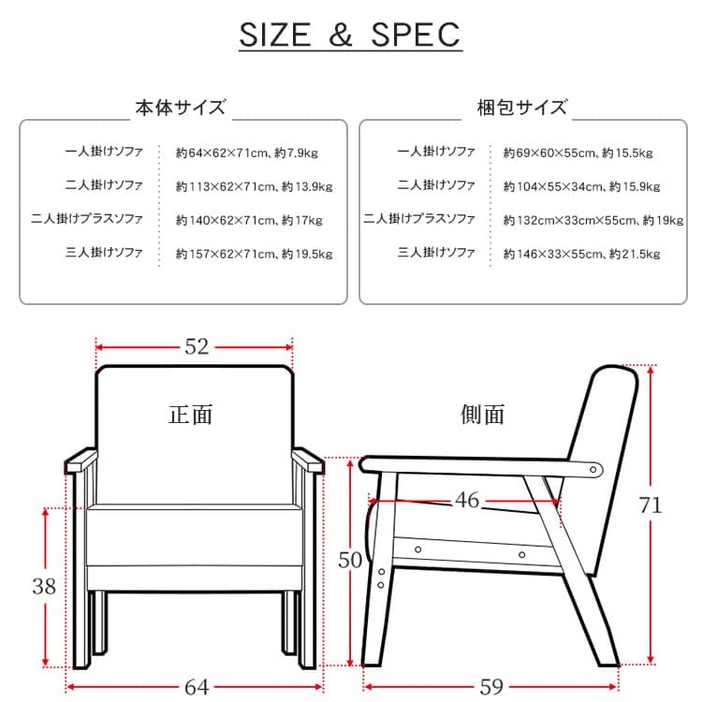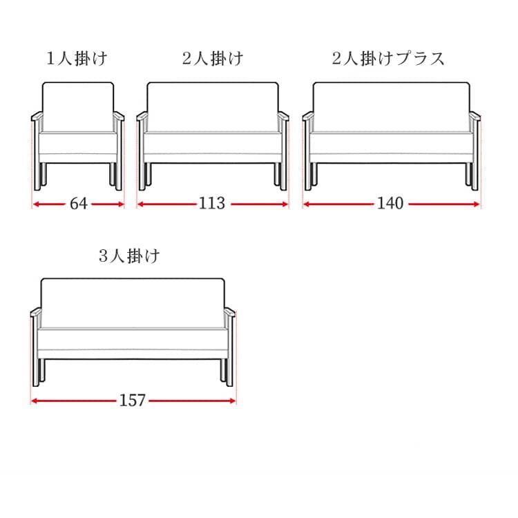 1人掛け: L64cm×W59cm×H71cm 2人掛け: L113cm×W59m×H71cm 2人掛け: L140cm×W59m×H71cm 3人掛け: L157cm×W59m×H71cm |