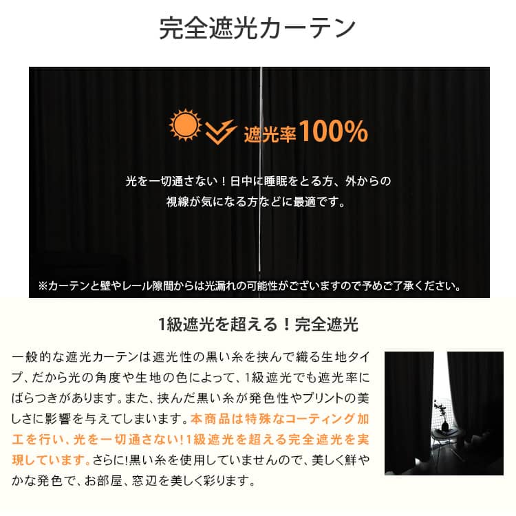 寝室用に購入。完全遮光で生地もほこりが付きにくく良かった。