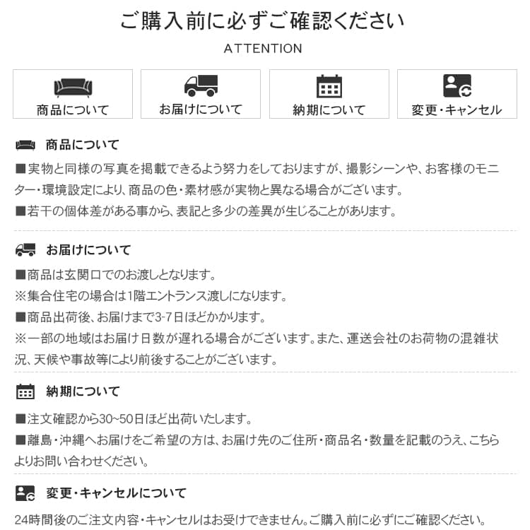 | 備考 | ■お客様組み立て品です。 ■ご購入頂く前に商品サイズ、必要な搬入間口のサイズ、設置する場所までのルートや出入口の幅・高さを十分にご確認ください。 ※確認方法はこちらへ 【色・サイズについて】 ◆お使いのモニター設定、お部屋の照明等により実際の商品と色味が異なる場合がございます。 ◆若干の個体差がある事から、表記と多少の差異が生じることがあります。 【納期について】 ◆注文確認から20-30営業日ほど出荷いたします。 ◆納期に余裕を持ったご注文をお願い致します。 (一部地域についてお届けできない場合があります) 【離島・沖縄・北海道へのお届け】 離島・沖縄へお届けをご希望の方は、サイト上からはご注文いただけません。 お届け先のご住所・商品名・数量を記載のうえ、こちらよりお問い合わせください。 弊社にて内容を確認した後、お届け可否・送料を含めたお見積もりをメールにてお送りいたします。 |