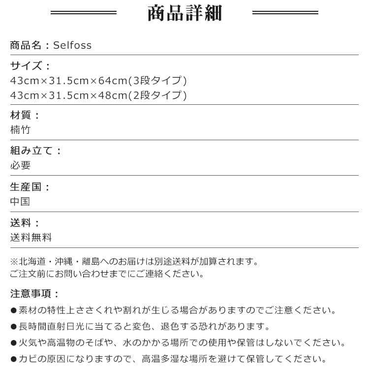 | サイズ | 3段タイプ: 43*31.5*64CM 2段タイプ: 43*31.5*48CM |