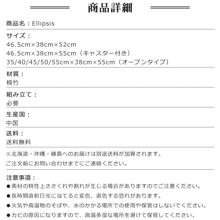 | サイズ | オープンタイプ: 幅35/40/45/50/55cm×奥行38cm×高さ55cm 引き出し付きタイプ: 幅46.5cm×奥行38cm×高さ55cm |