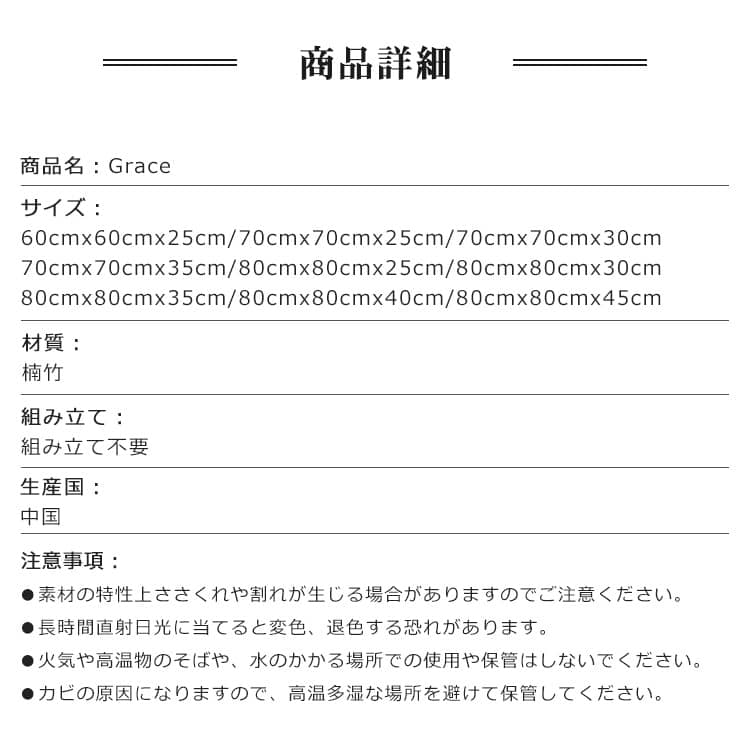 | サイズ | 60cm×60cm×25cm 70cm×70cm×25cm 70cm×70cm×30cm 70cm×70cm×35cm 80cm×80cm×25cm 80cm×80cm×30cm 80cm×80cm×35cm 80cm×80cm×40cm 80cm×80cm×45cm |