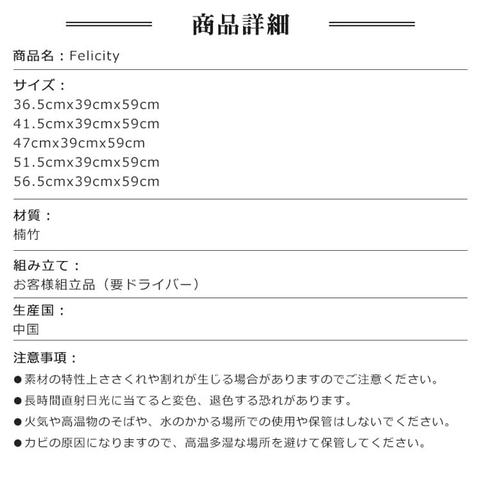 | 備考 | ■お客様組み立て品です。 ■ご購入頂く前に商品サイズ、必要な搬入間口のサイズ、設置する場所までのルートや出入口の幅・高さを十分にご確認ください。 ※確認方法はこちらへ ■素材の特性上ささくれや割れが生じる場合がありますのでご注意ください。 ■長時間直射日光に当てると変色、退色する恐れがあります。 ■火気や高温物のそばや、水のかかる場所での使用や保管をしないでください。 ■カビの原因になりますので、高温多湿な場所を避けて保管してください。 【色・サイズについて】 ◆お使いのモニター設定、お部屋の照明等により実際の商品と色味が異なる場合がございます。 ◆若干の個体差がある事から、表記と多少の差異が生じることがあります。 【納期について】 ◆注文確認から20-30営業日ほど出荷いたします。 ◆納期に余裕を持ったご注文をお願い致します。 (一部地域についてお届けできない場合があります) 【離島・沖縄・北海道へのお届け】 離島・沖縄へお届けをご希望の方は、サイト上からはご注文いただけません。 お届け先のご住所・商品名・数量を記載のうえ、こちらよりお問い合わせください。 弊社にて内容を確認した後、お届け可否・送料を含めたお見積もりをメールにてお送りいたします。 |