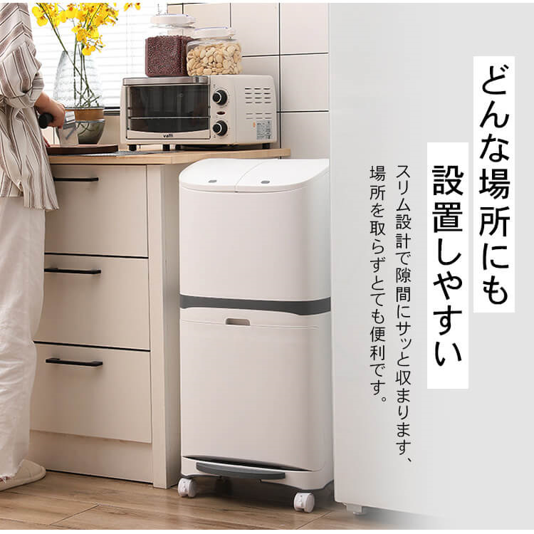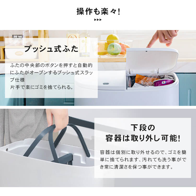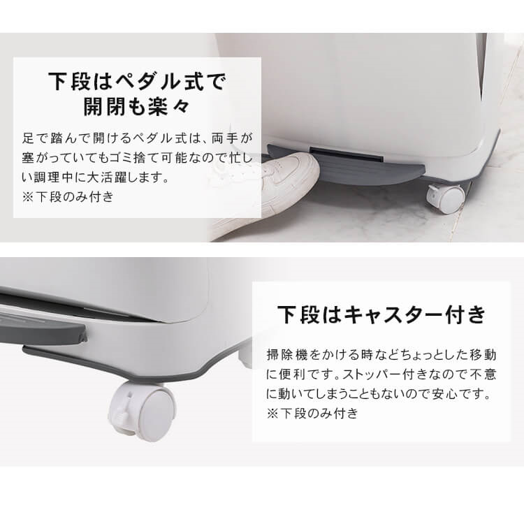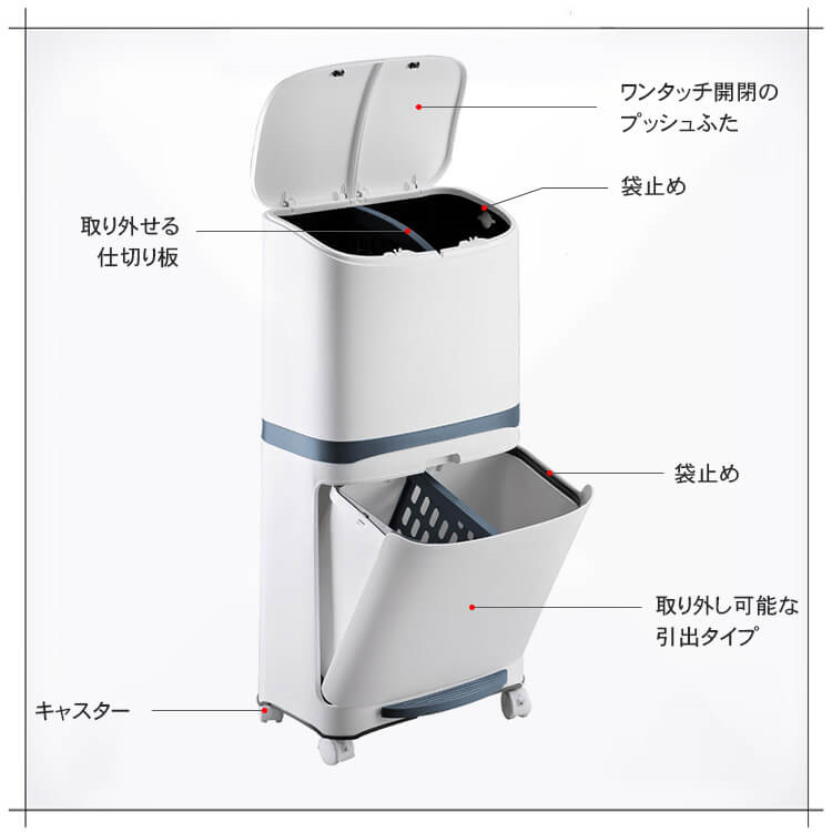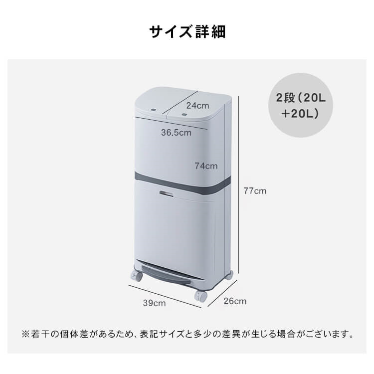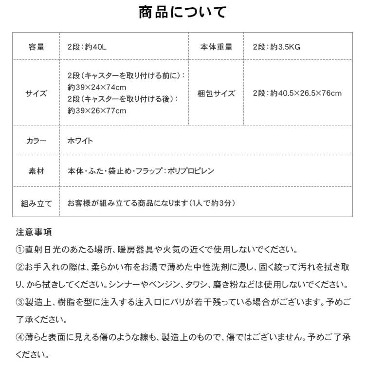 | 注意事項 | ①上段のゴミ容器には重いものをいれないようにしてください。不安定になり転倒の原因となります。 ②平らな場所に設置し、ゴミ容器の背面は壁などに沿わせるなど安定性をご確認いただいた上でご使用ください。 ③製造上、樹脂を型に注入する注入口にバリが若干残っている場合がございます。予めご了承ください。 ④薄らと表面に見える傷のような線も、製造上のもので、傷ではございません。予めご了承ください。 |
