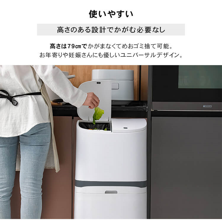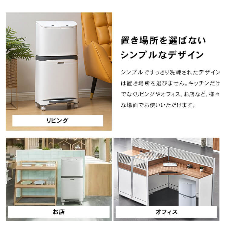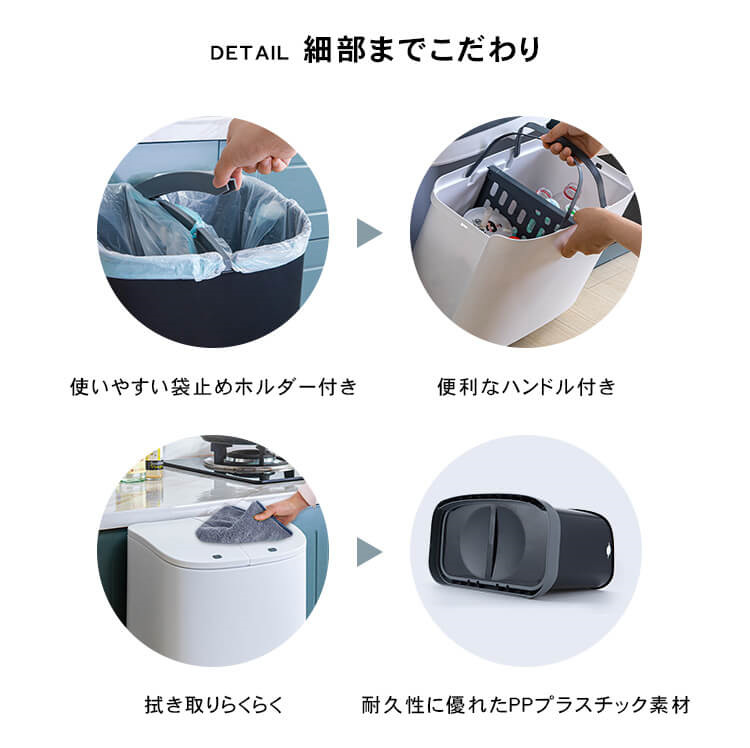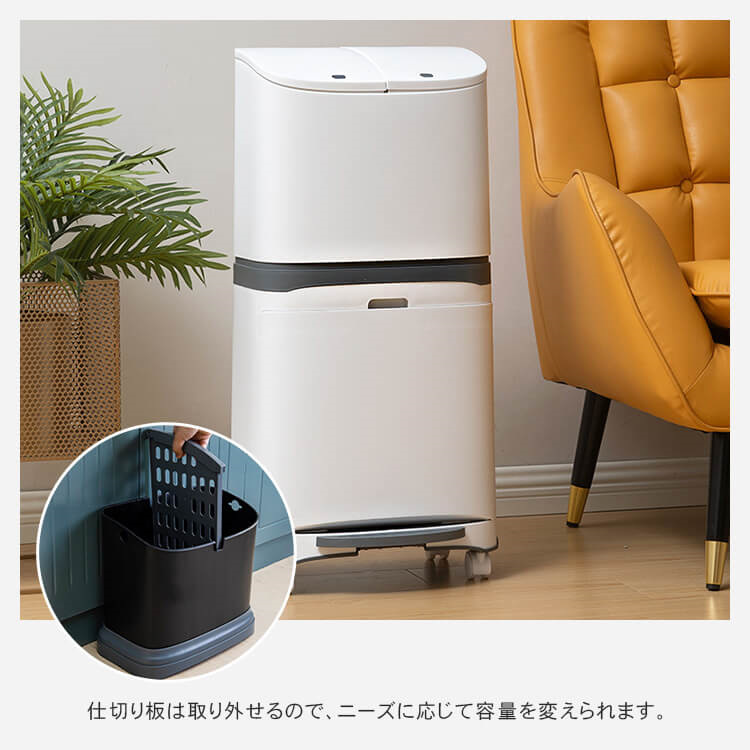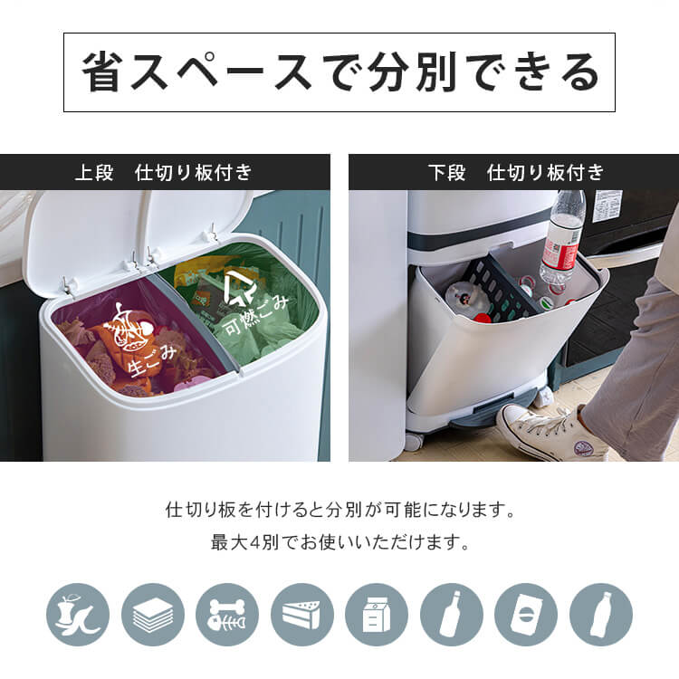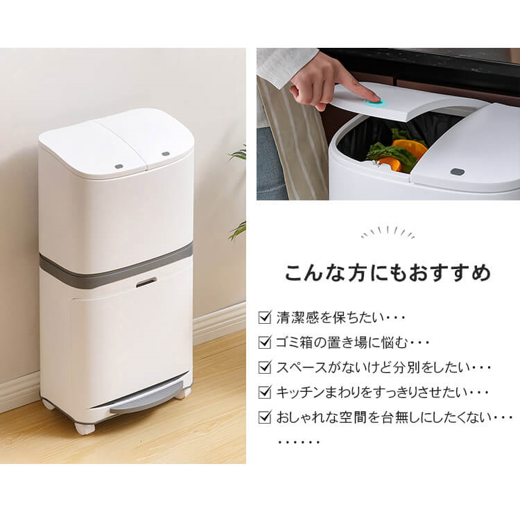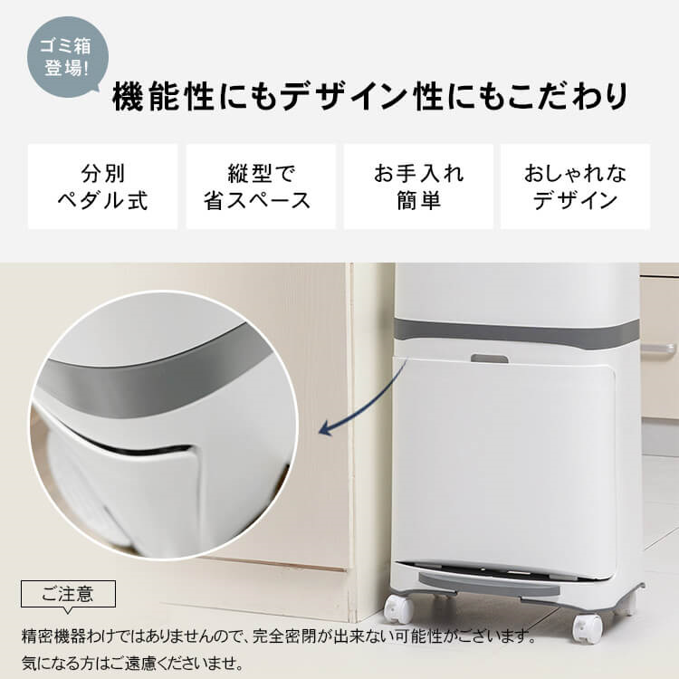 | 注意事項 | ①上段のゴミ容器には重いものをいれないようにしてください。不安定になり転倒の原因となります。 ②平らな場所に設置し、ゴミ容器の背面は壁などに沿わせるなど安定性をご確認いただいた上でご使用ください。 ③製造上、樹脂を型に注入する注入口にバリが若干残っている場合がございます。予めご了承ください。 ④薄らと表面に見える傷のような線も、製造上のもので、傷ではございません。予めご了承ください。 |