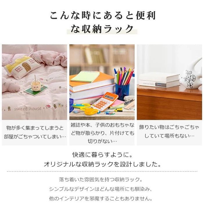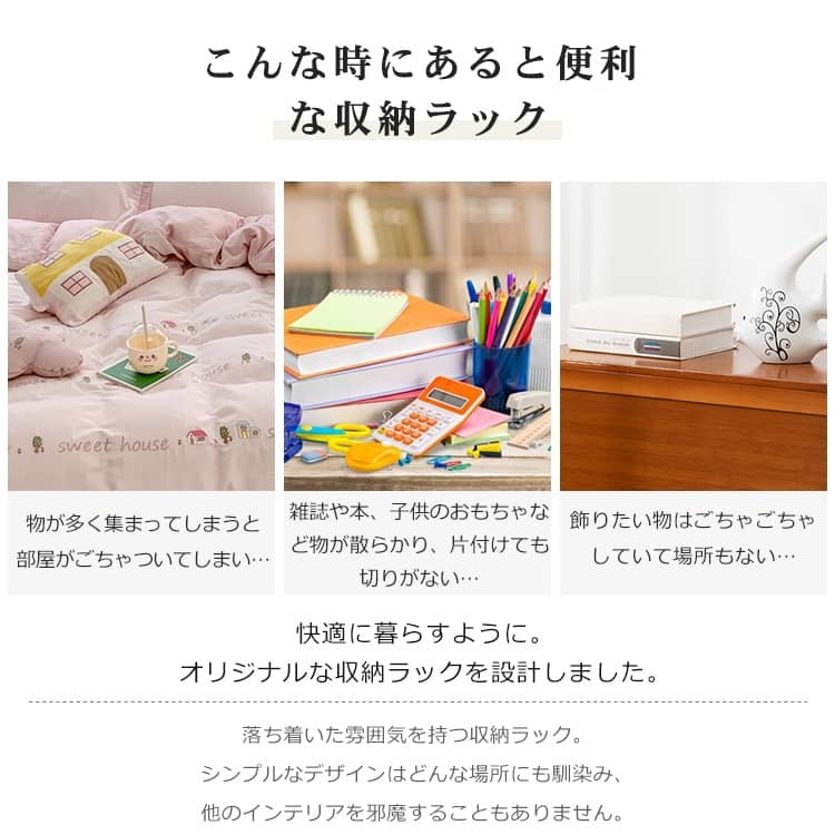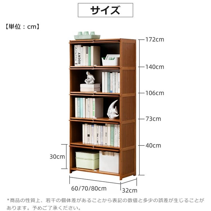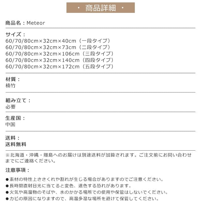 | サイズ | 1段: 幅60/70/80cm×奥行32cm×高さ40cm 2段: 幅60/70/80cm×奥行32cm×高さ73cm 3段: 幅60/70/80cm×奥行32cm×高さ106cm 4段: 幅60/70/80cm×奥行32cm×高さ140cm 5段: 幅60/70/80cm×奥行32cm×高さ172cm |