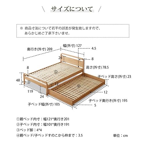 | サイズ | 親ベッド: L127cm×W209cm×H78.5cm 子ベッド: L105cm×W195cm×H23cm |