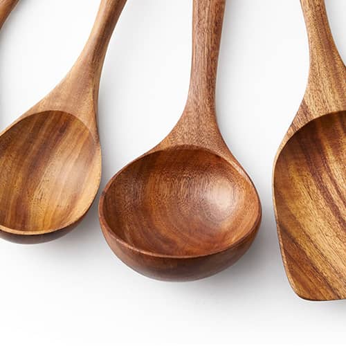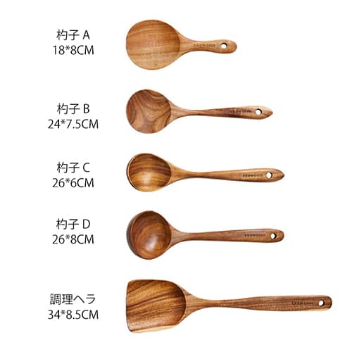 杓子A:L18cmxW8cm 杓子B:L24cmxW7.5cm 杓子C:L26cmxW6cm 杓子D:L26cmxW8cm 調理ヘラ:L34cmxW8.5cm