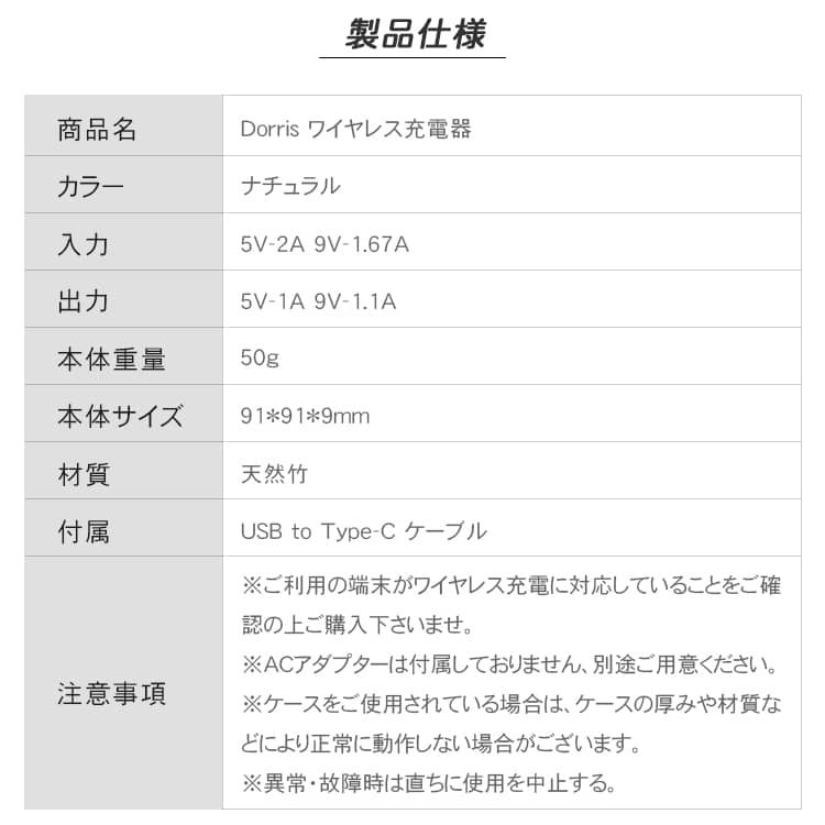 | 注意事項 | ◆ご利用の端末がワイヤレス充電に対応していることをご確認の上ご購入くださいませ。 ◆ACアダプターは付属しておりません、別途ご用意ください。 ◆ケースをご使用されている場合は、ケースの厚みや材質などにより、正常に動作しない場合がございます。 ◆異常・故障時は直ちに使用を中止してください。 |