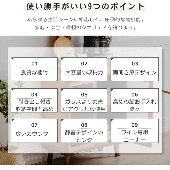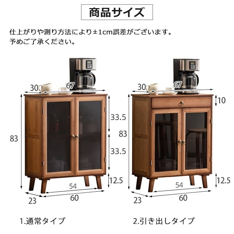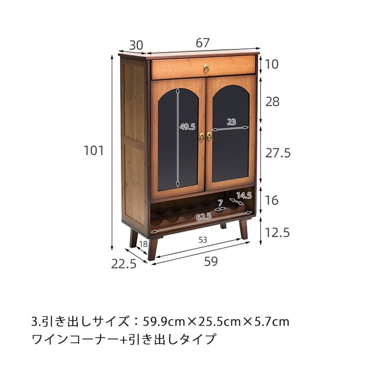 | サイズ | 【通常タイプ】:83cm×67cm×30cm 【引き出しタイプ】:83cm×67cm×30cm 【ワインコーナー+引き出しタイプ】:101cm×67cm×30cm |
