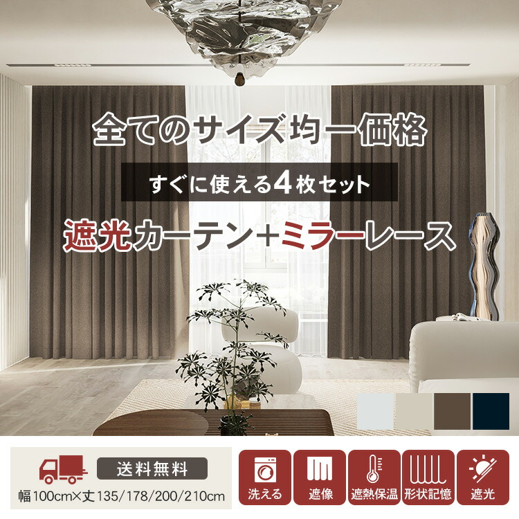 | 関連キーワード | カーテン 4枚セット 遮光カーテン 1級遮光 2級遮光 ミラーレース付き 形状記憶 送料無料 UVカット 遮熱 保温 防音 幅100cm 丈135 178 200 210cm グレー ブラウン ベージュ ネイビー 均一価格 既成カーテン 既製品 無地 遮光 |