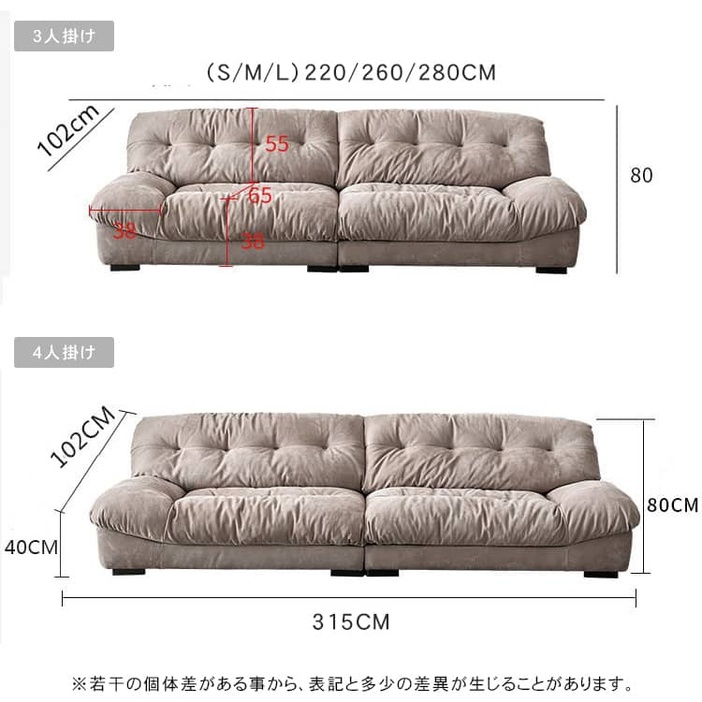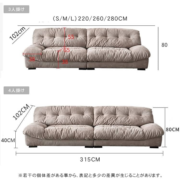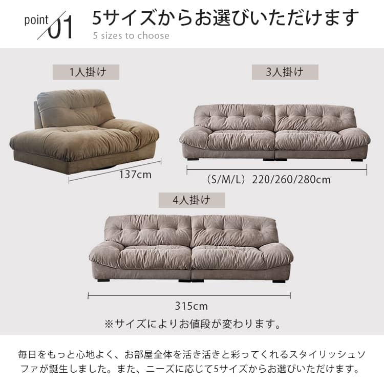 | サイズ | 一人掛け:約137*102*80cm 三人掛け:約220/260/280*102*80cm 四人掛け:約315*102*80cm |