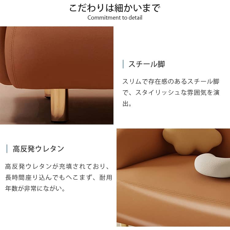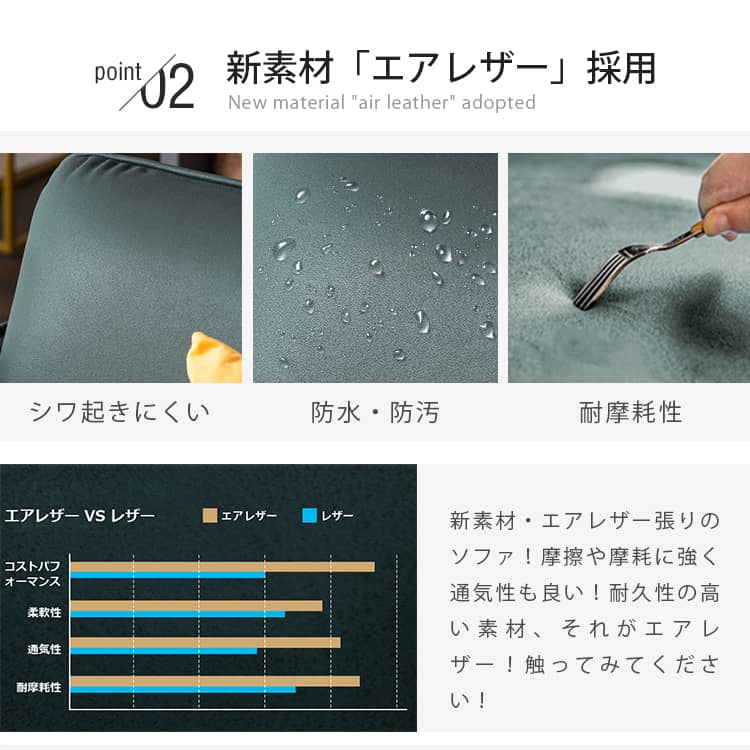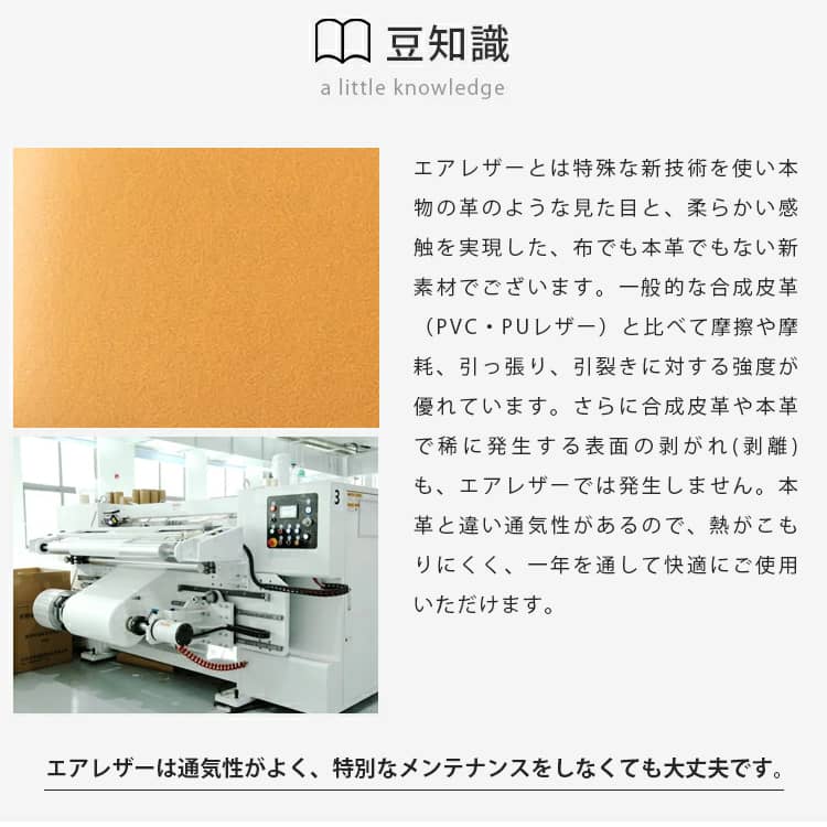 | 素材 | 張地: エアレザー 座面: ウレタン+ポリエステル 背もたれクッション: ウレタン+ポリエステル フレーム: パイン |