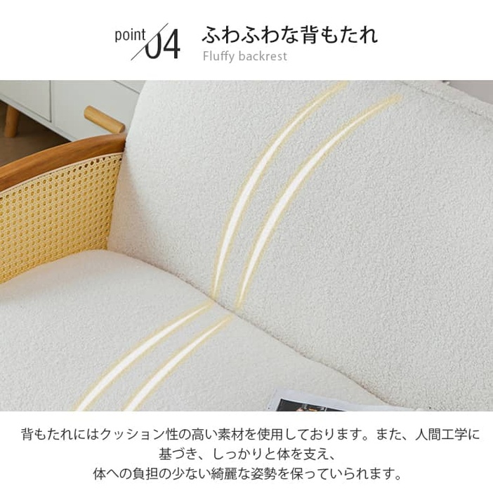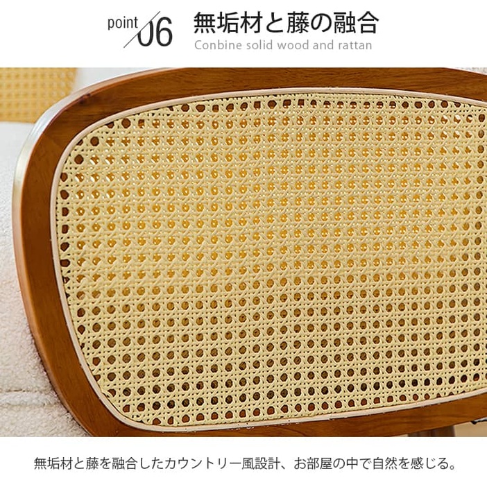 | 素材 | 張地: ファブリック 座面: ウレタン+ポリエステル 背もたれクッション: ウレタン+ポリエステル 肘掛け:ラタン フレーム: パイン |