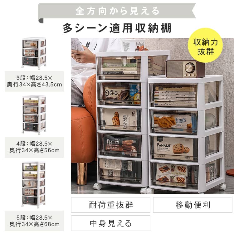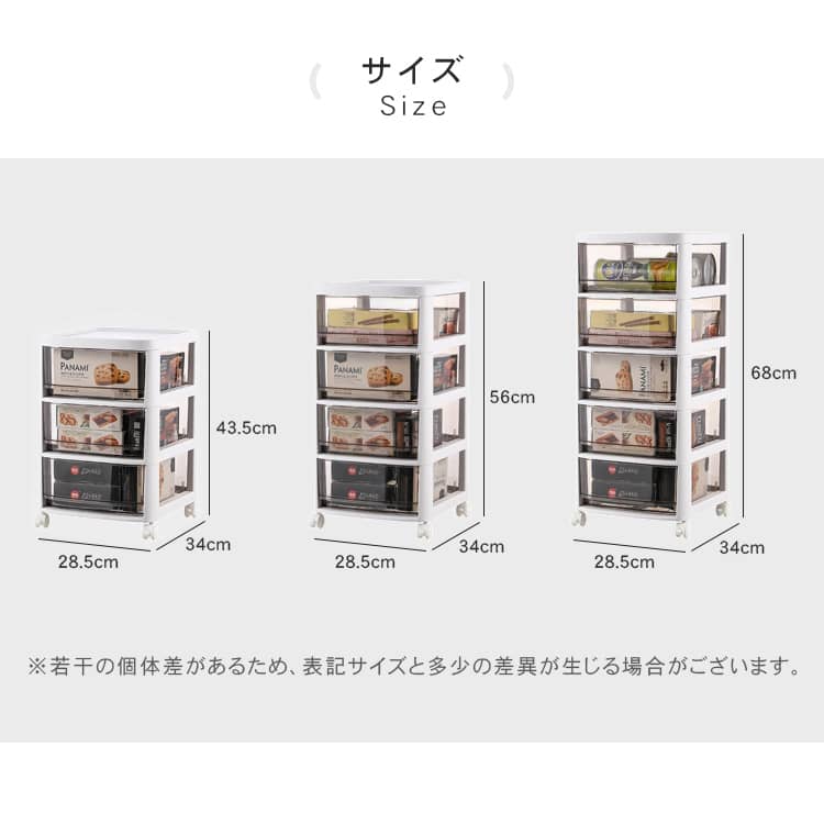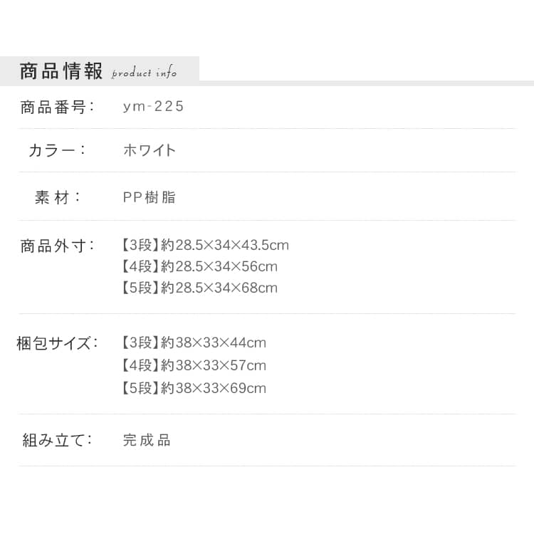 | サイズ | 【3段】28.5cmx34cmx43.5cm 【4段】28.5cmx34cmx56cm 【5段】28.5cmx34cmx68cm |
