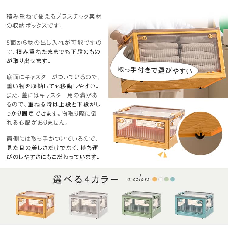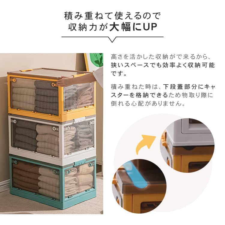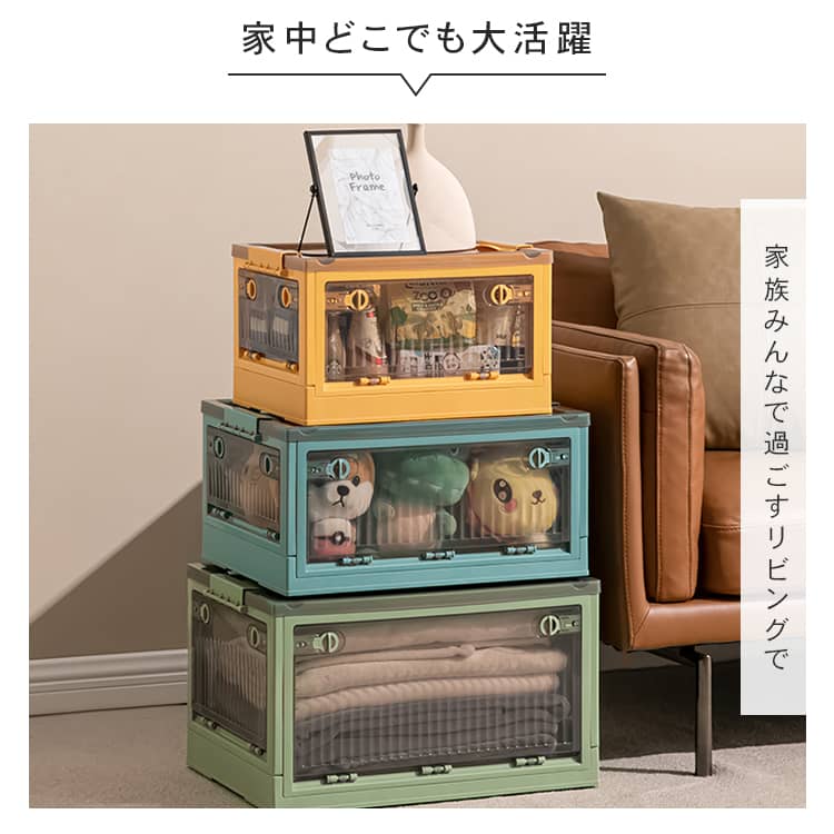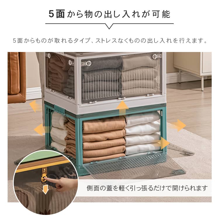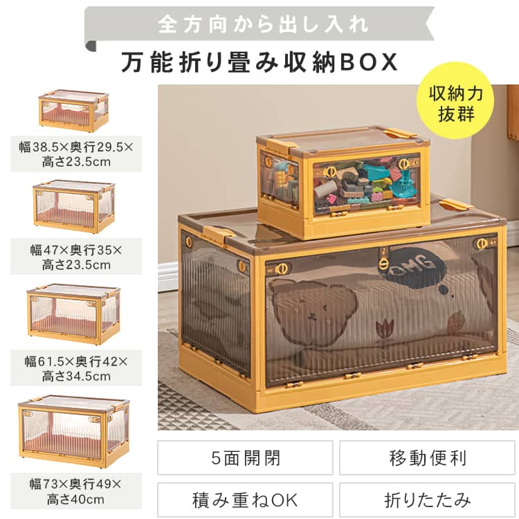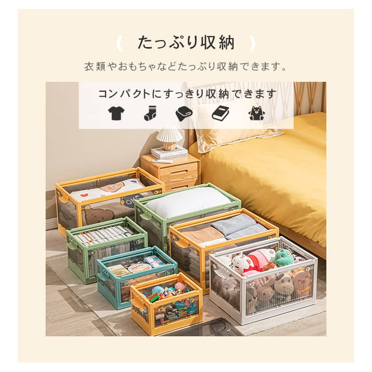 | おすすめのポイント | ■全方向から出し入れ、万能折り畳み収納BOX。 ■衣類やおもちゃなどたっぷり収納できます。 ■省スペース設計、使用しない時は折りたたんで、家具の隙間にサッと納めます。 ■積み重ねて使えるので、狭いスペースでも効率的に利用できます。積み上げの目安は最大4段までです。。 ■色んなシーンに活躍できます。 ■面倒な組み立ては不要、ほぼ完成品でお届けします。 |