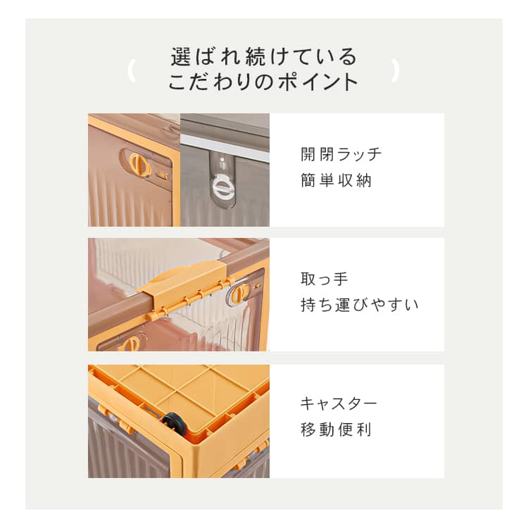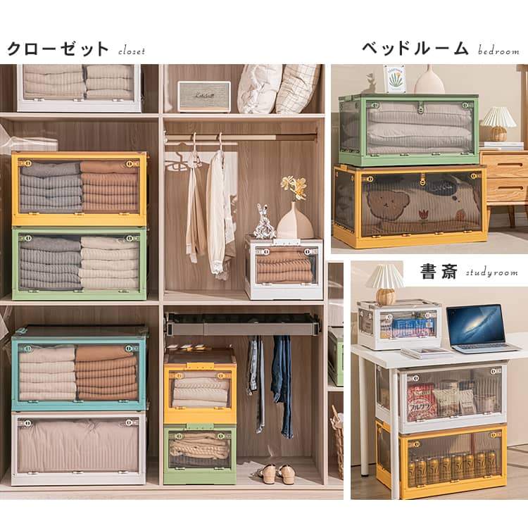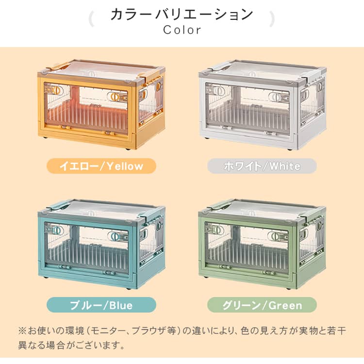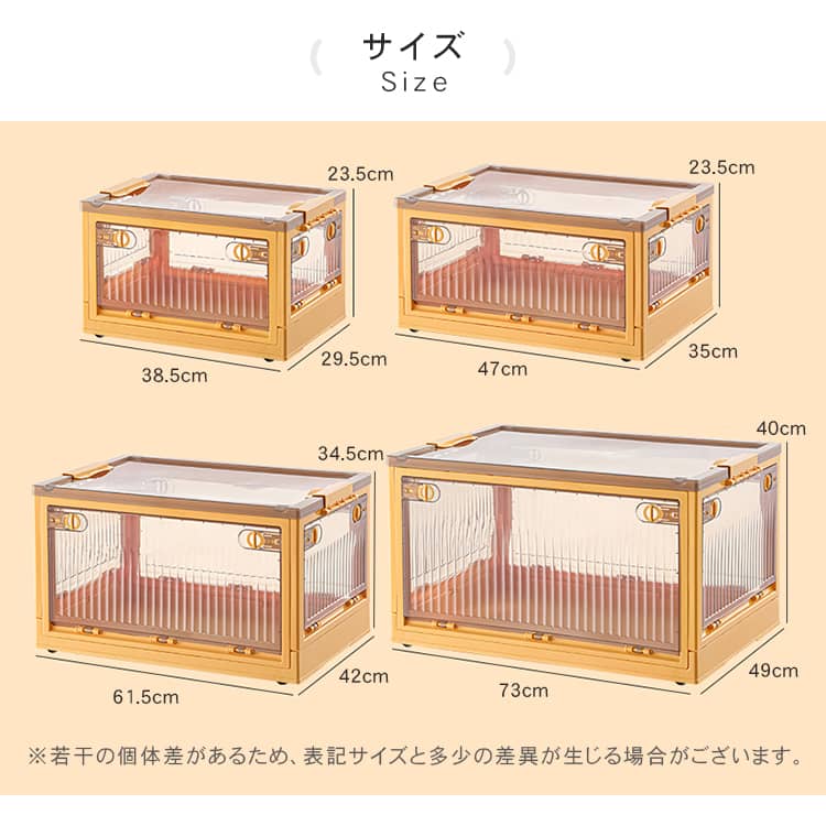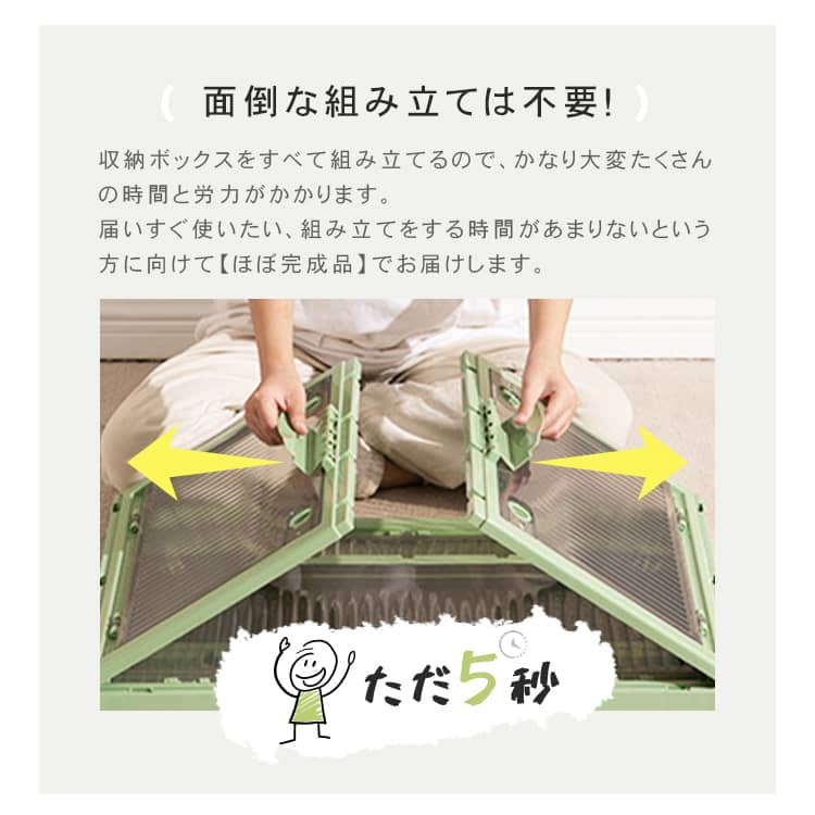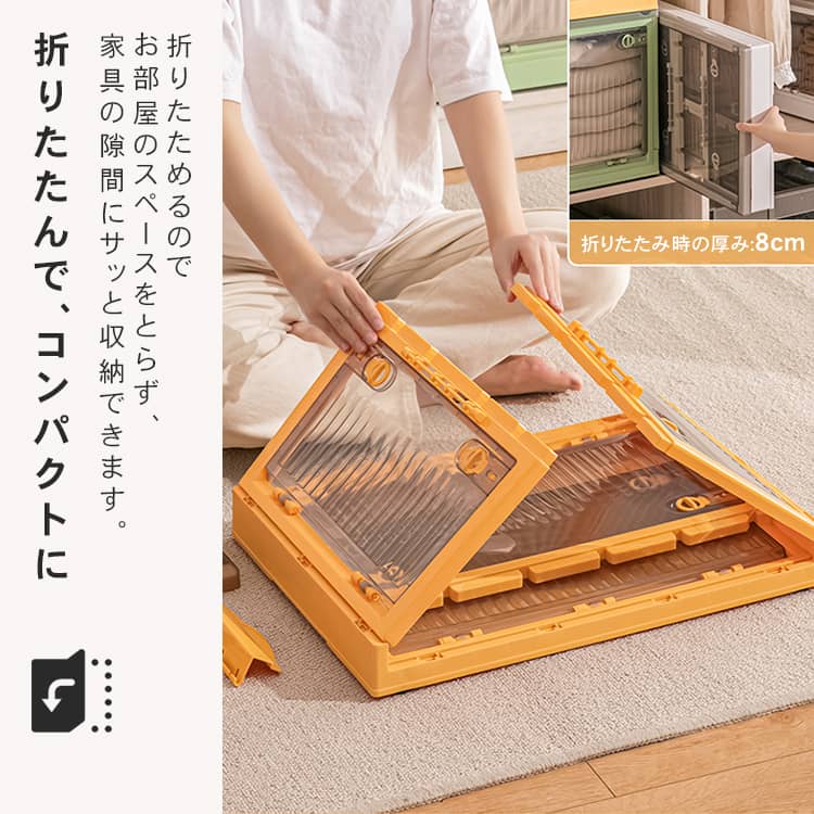 | おすすめのポイント | ■全方向から出し入れ、万能折り畳み収納BOX。 ■衣類やおもちゃなどたっぷり収納できます。 ■省スペース設計、使用しない時は折りたたんで、家具の隙間にサッと納めます。 ■積み重ねて使えるので、狭いスペースでも効率的に利用できます。積み上げの目安は最大4段までです。。 ■色んなシーンに活躍できます。 ■面倒な組み立ては不要、ほぼ完成品でお届けします。 |