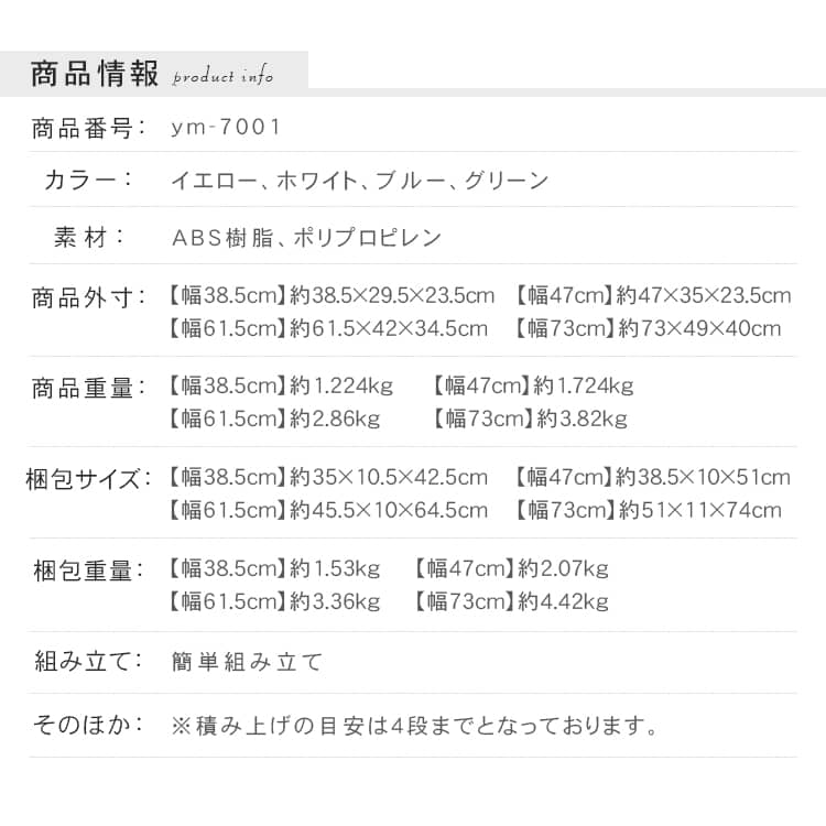 | 商品重量 | ボックス ■【幅38.5cm】約1.224kg ■【幅47cm】約1.724kg ■【幅61.5cm】約2.86kg ■【幅73cm】約3.82kg |