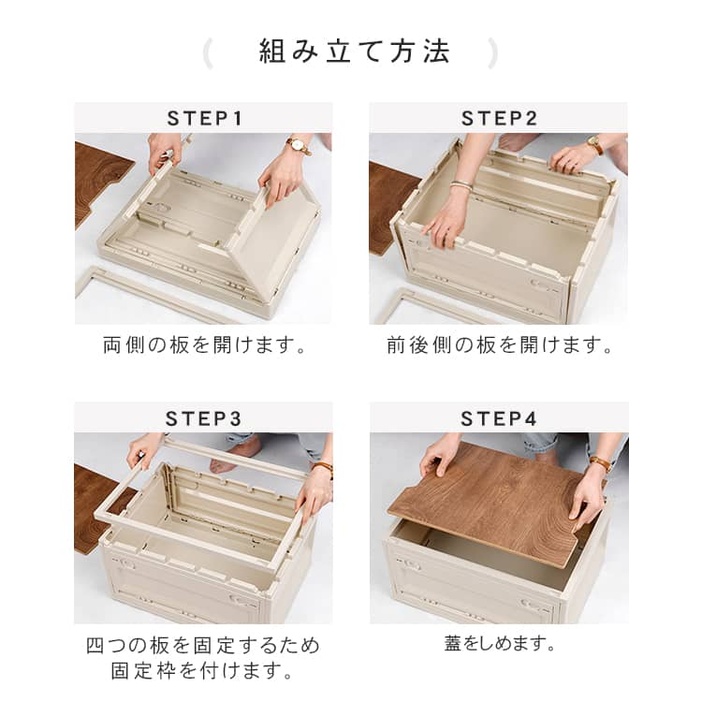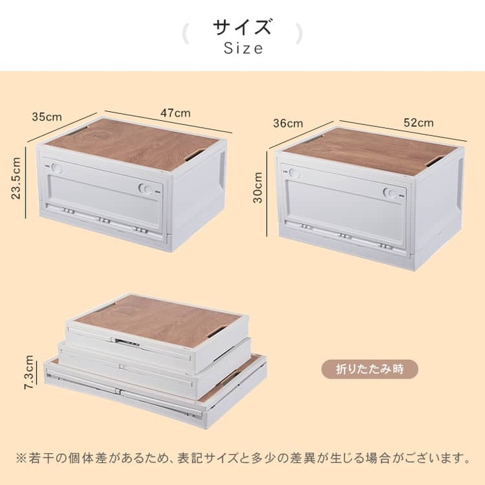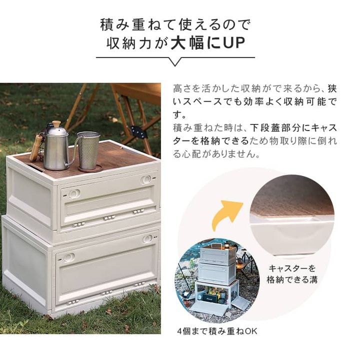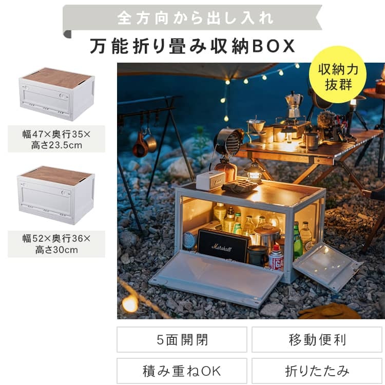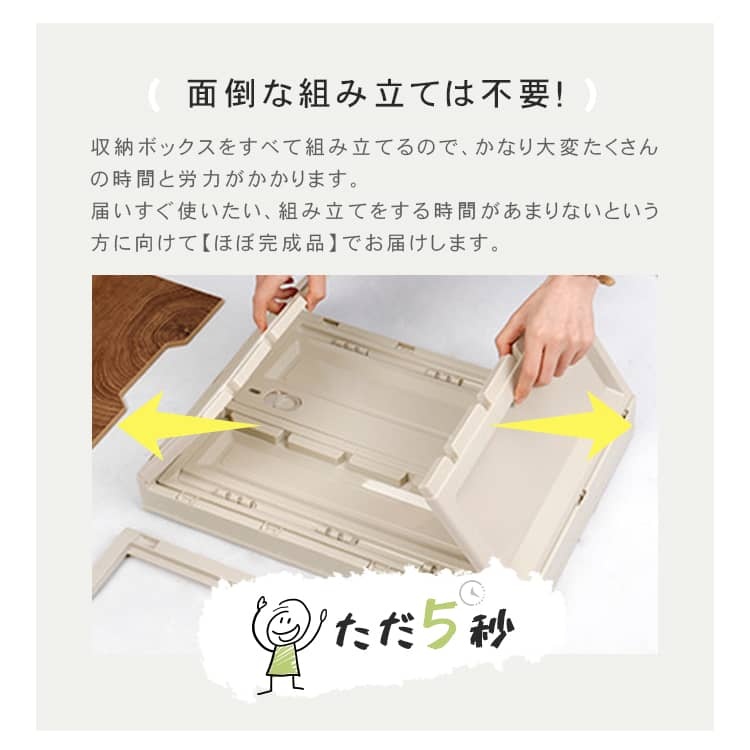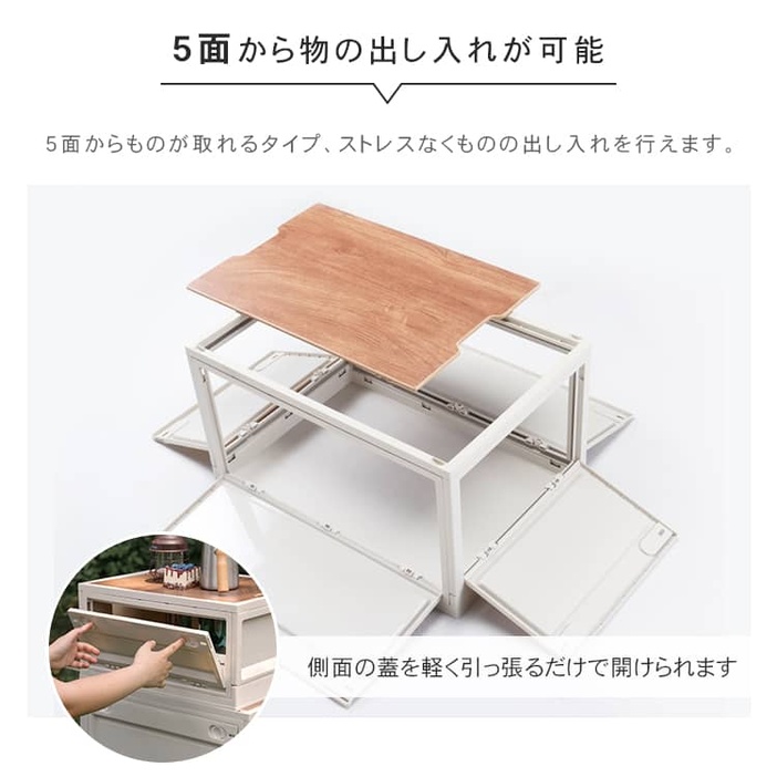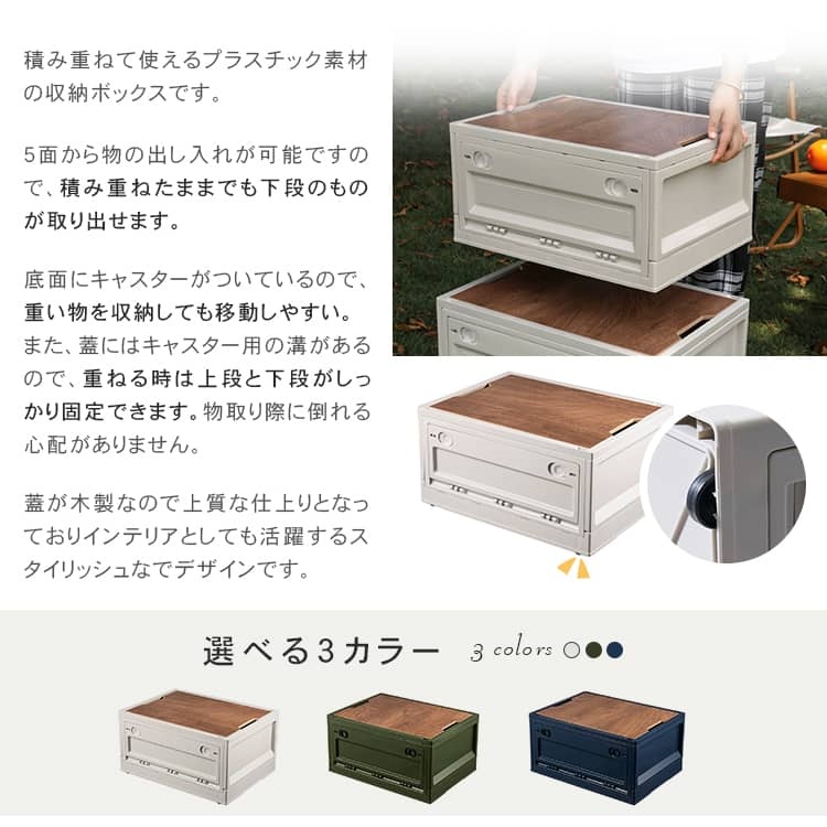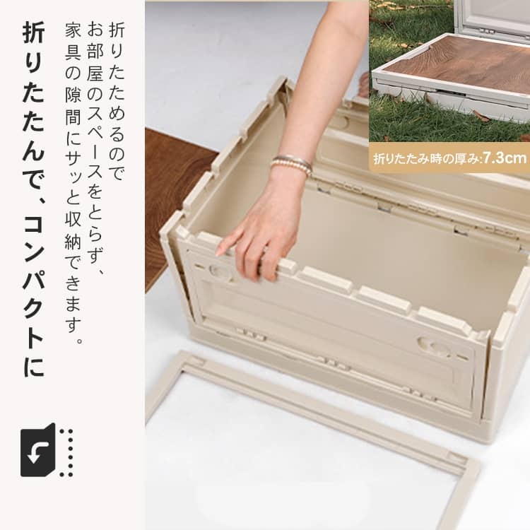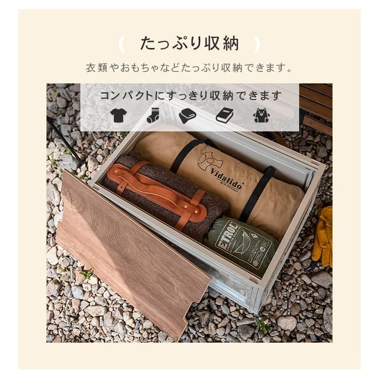 | おすすめのポイント | ■全方向から出し入れ、万能折り畳み収納BOX。 ■衣類やおもちゃなどたっぷり収納できます。 ■省スペース設計、使用しない時は折りたたんで、家具の隙間にサッと納めます。 ■積み重ねて使えるので、狭いスペースでも効率的に利用できます。積み上げの目安は最大4段までです。 ■蓋は木製なので、テーブルとしても使えます。 ■面倒な組み立ては不要、ほぼ完成品でお届けします。 |