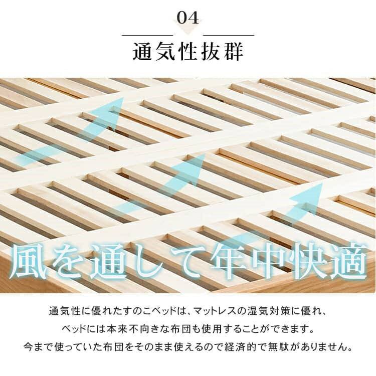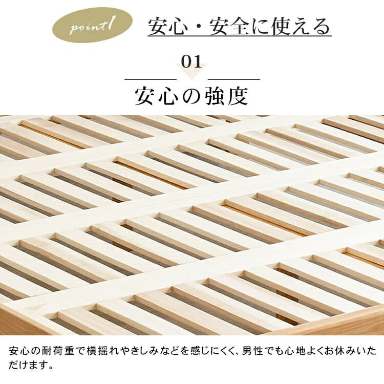 | おすすめポイント | ■安全・安心な強度。 ■角丸設計で安心・安全。 ■環境に優しい塗装。 ■見た目と実用性をこだわったベッドフレーム。 ■掃除しやすい下空間。 ■すのこベッドは通気性抜群。 |