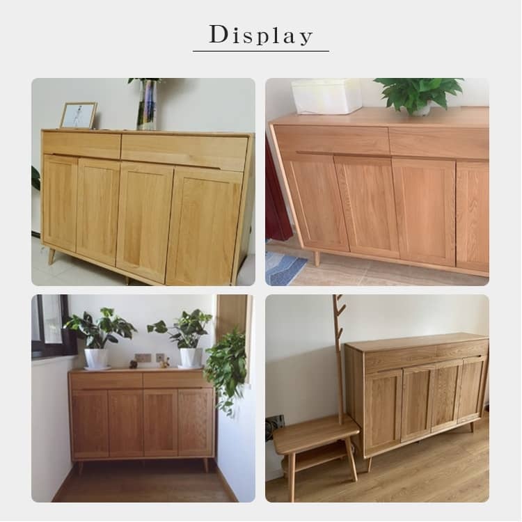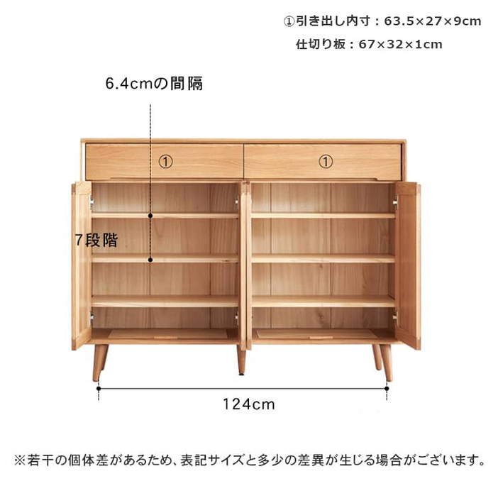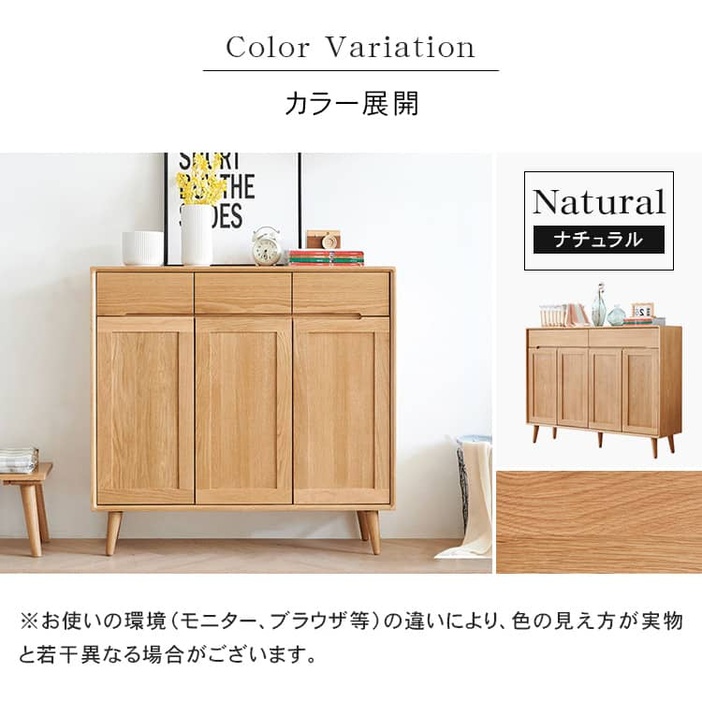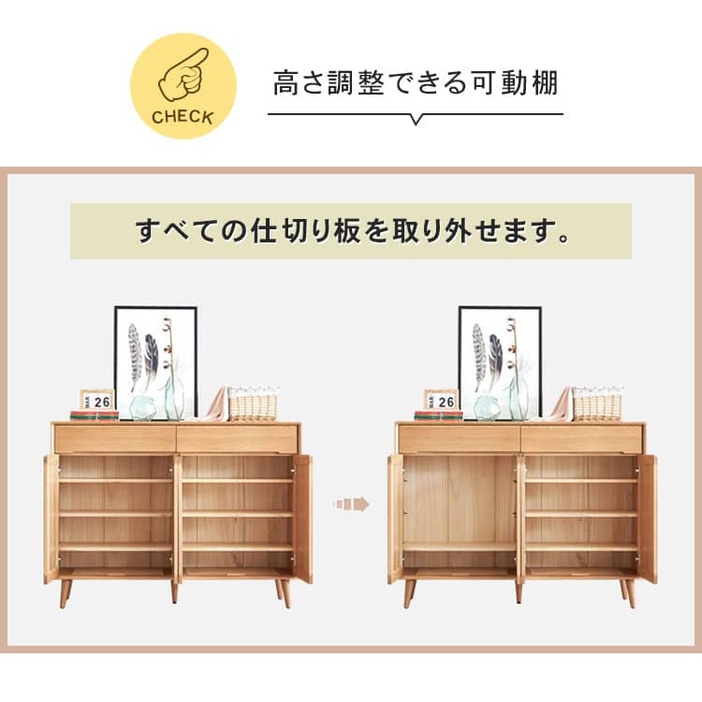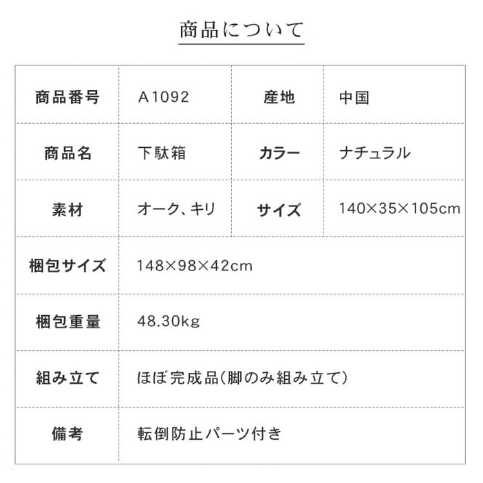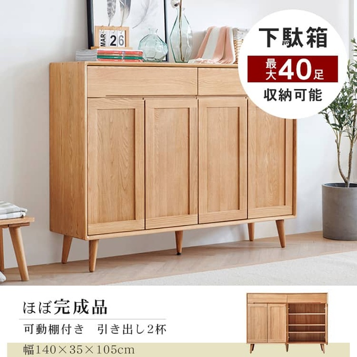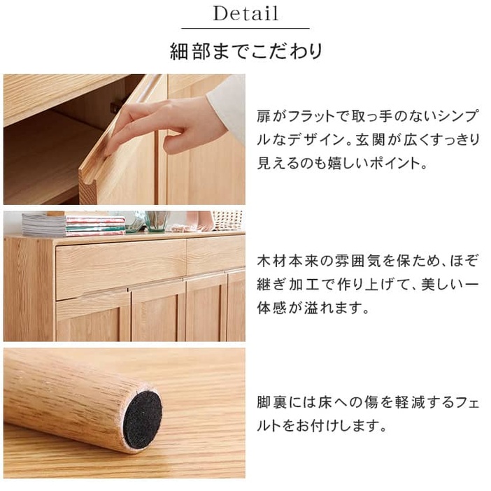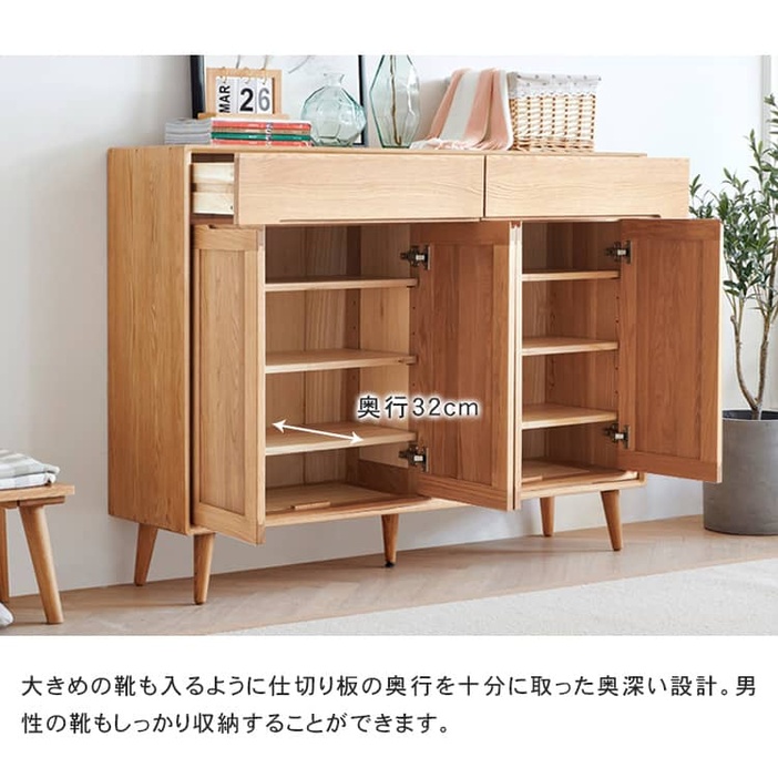 | おすすめのポイント | ■オーク材を贅沢に使用しており、ならではのぬくもり、木目や風合いを楽しむことができます。 ■大容量&どんな靴もぴったり収納できます。最大40足収納可能です。 ■引出し2杯付き、よく使う小物や靴下などもばっちり収納できます。 ■可動棚につき、ニーズに合わせて高さを調節ができます。 ■可動棚につき、上下約6.4cmの間隔ニーズに合わせて高さを調節ができます。 ■大きめの靴を入れるように仕切り板の奥行を十分に取った奥深い設計。男性の靴もしっかり収納することができます。 ■角を丸くした安全に配慮した設計で、お子様のいるご家庭でも安心してご使用いただけます。 ■補助脚付き、頑丈な4本脚以外に、本体をしっかり支えるため、1本の補助脚を付いております。 ■足の高さは約17cm。掃除機や掃除ロボットが入りやすく、日常のお掃除が楽々。 ■扉がフラットで取っ手のないシンプルなデザインで玄関がすっきりして広く見えます。 ■脚裏には床への傷を防ぐフェルトを付きます。 |