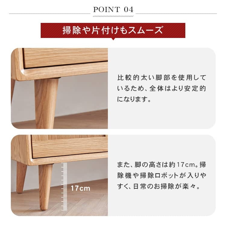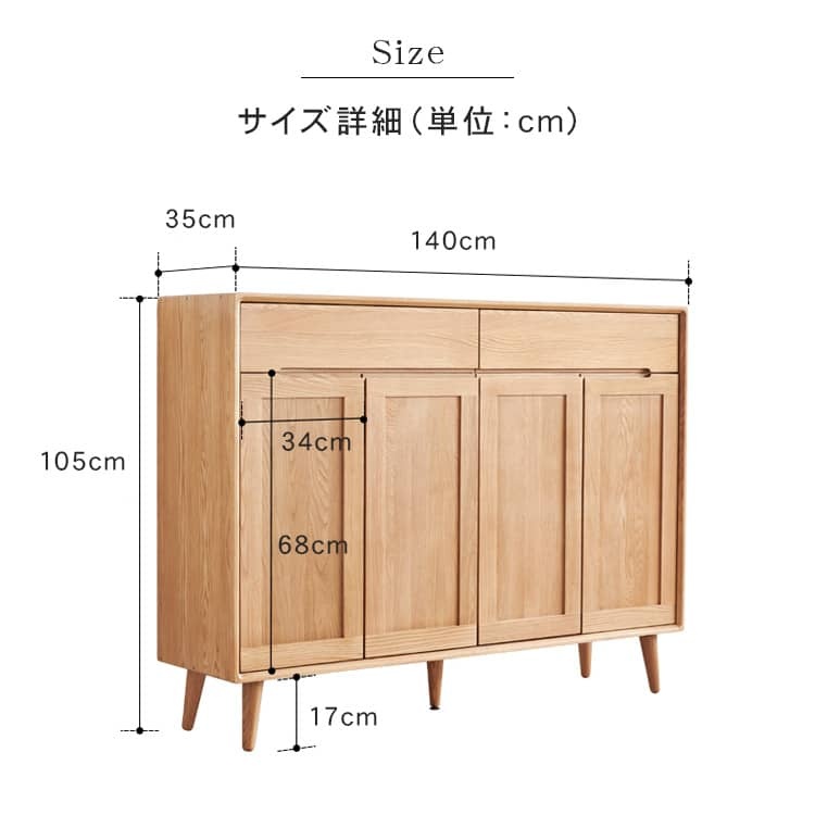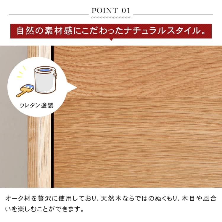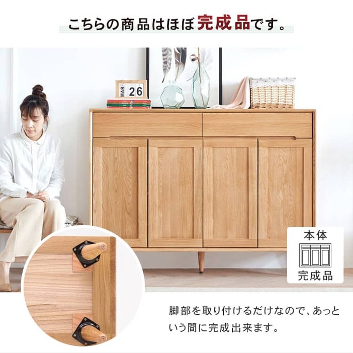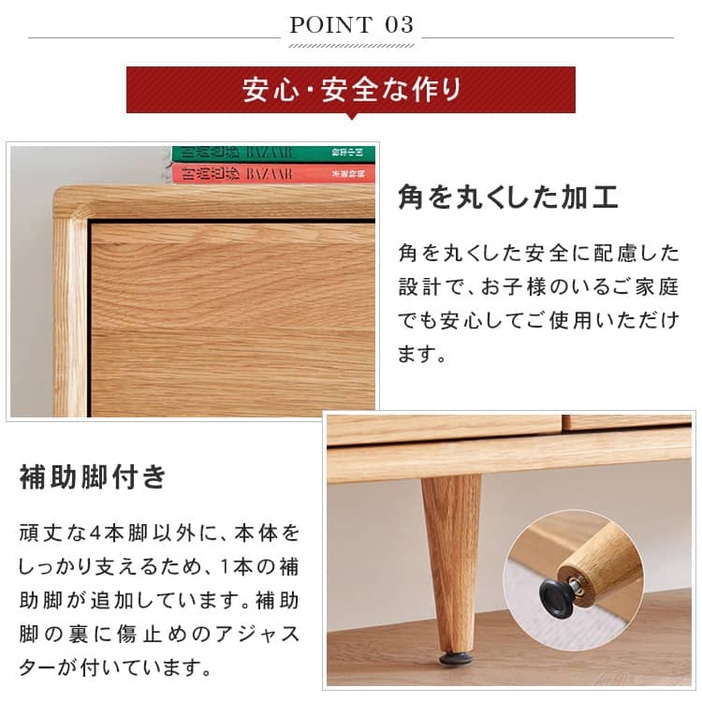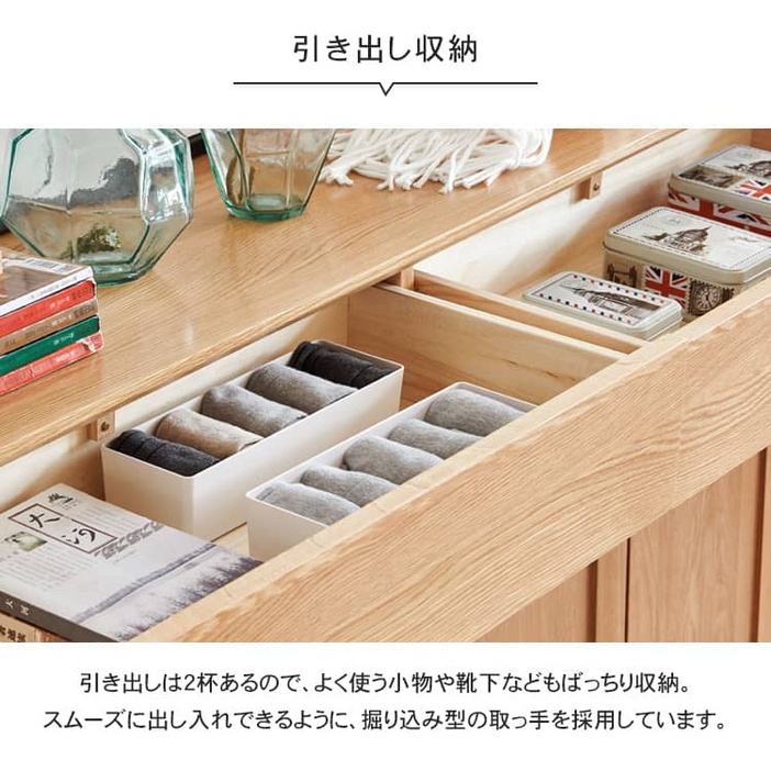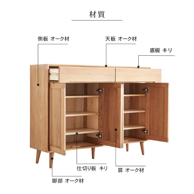 | 素材 | ■天板、側板:オーク材 ■仕切り板:キリ ■脚部:オーク材 ■底板:キリ ■扉:オーク材 |