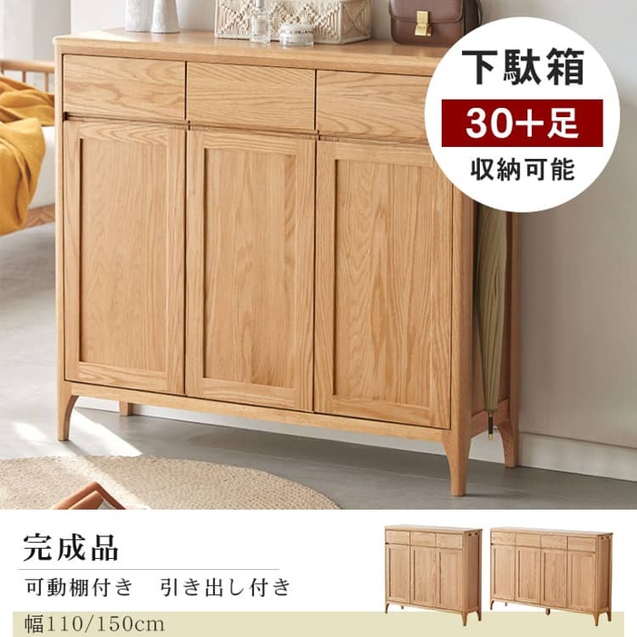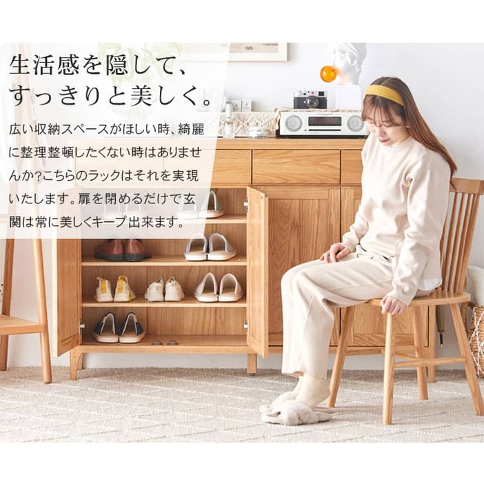 | おすすめのポイント | ■オーク材を贅沢に使用しており、ならではのぬくもり、木目や風合いを楽しむことができます。 ■大容量&どんな靴もぴったり収納できます。最大30足収納可能です。 ■引出し付き、よく使う小物や靴下などもばっちり収納できます。 ■可動棚1枚につき、上下約3.2cmの間隔で同じ角度で2段階の高さを調節ができます。 ■可動棚につき、上下約3.2cmの間隔でニーズに合わせ高さを調節ができます。 ■転倒防止パーツ付き、家具をしっかり固定して使用できます。 ■比較的太い脚部を使用して、全体はより安定的になります。 ■足の高さは約12cm。掃除機や掃除ロボットが入りやすく、日常のお掃除が楽々。 ■扉がフラットで取っ手のないシンプルなデザインで玄関がすっきりして広く見えます。 ■横側のラックで、傘や鞄などの収納に役立ちます。 |