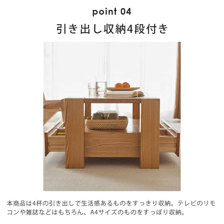 | おすすめのポイント | ■無駄を省いたシンプルで機能的なフォルム、素朴さ柔らかさを演出した、飽きの来ないスタイリッシュなデザインに仕上げてあります。 ■ちょっとした収納がほしい場所やワンルームに置いても邪魔にならず、お部屋に馴染むコンパクトなサイズです。 ■見た目、収納力、実用性にこだわりを持った方にぴったり商品となっていなす。 ■開放収納スペース+引き出し収納4段付き、散らかりやすい小物類、テレビのリモコンや雑誌などはもちろん、A4サイズのものをすっぽり収納できます。 ■安定性の高い頑丈な脚、揺れる事なく、安心してご使用いただけます。 ■面倒取付一切不要で、組み立て苦手な方も安心、届いたらすぐにお使いいただけます。 ■安全面に配慮して、角丸や面取り加工をしました。 |