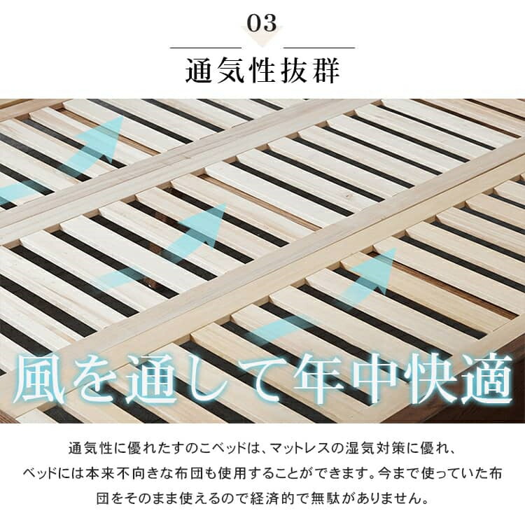 | おすすめポイント | ■安全・安心な強度。 ■角丸設計で安心・安全。 ■環境に優しい塗装。 ■見た目と実用性をこだわったベッドフレーム。 ■掃除しやすい下空間。 ■すのこベッドは通気性抜群。 |