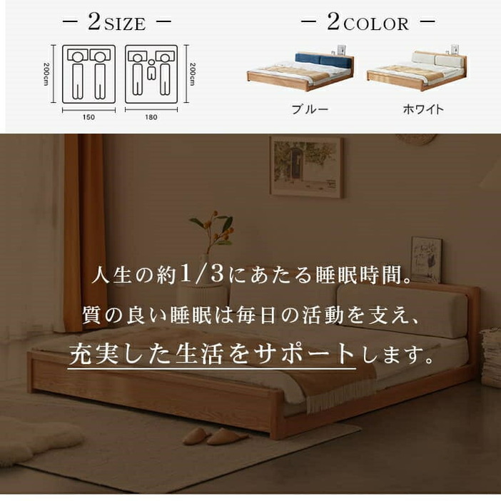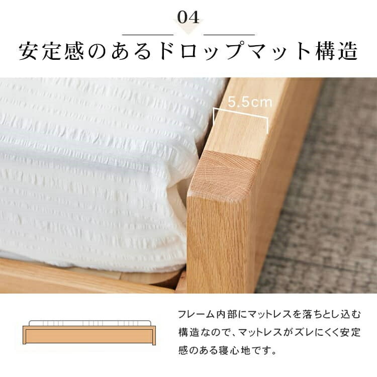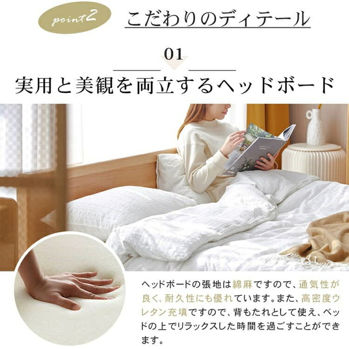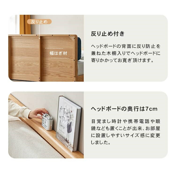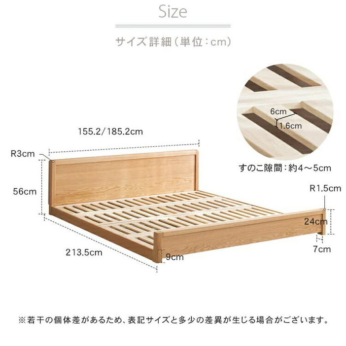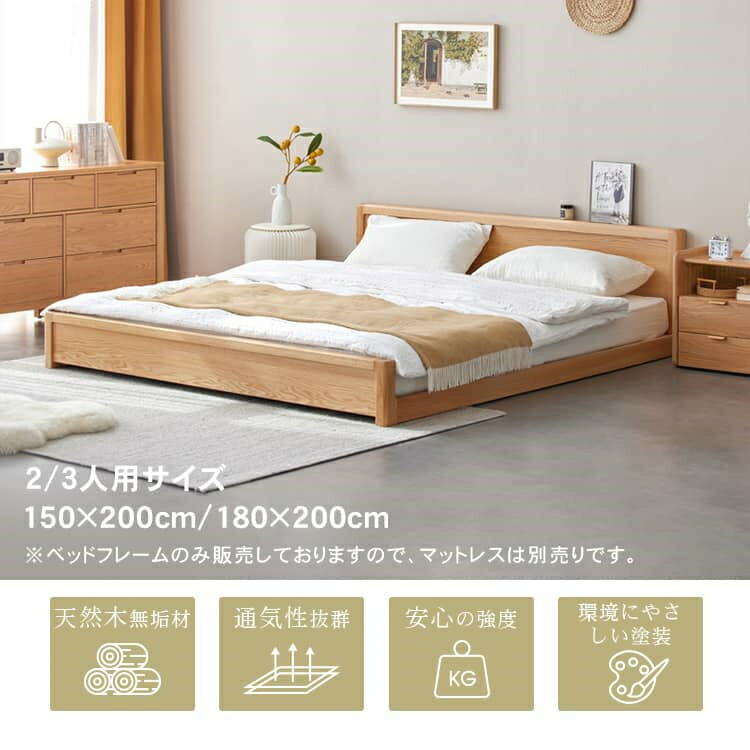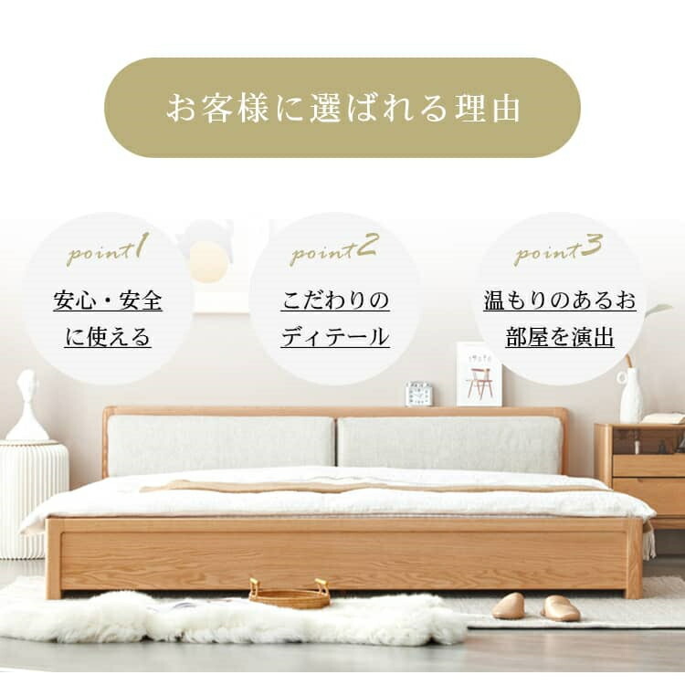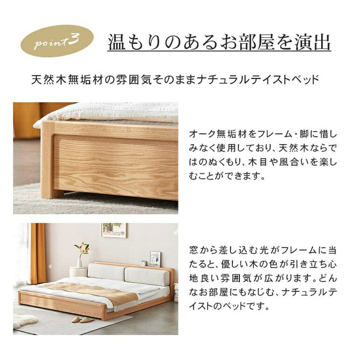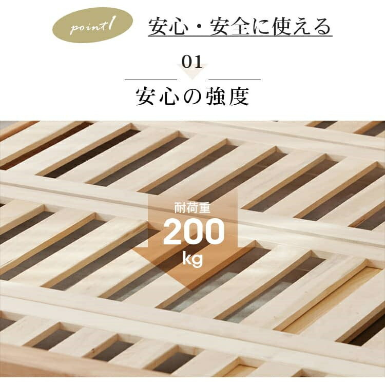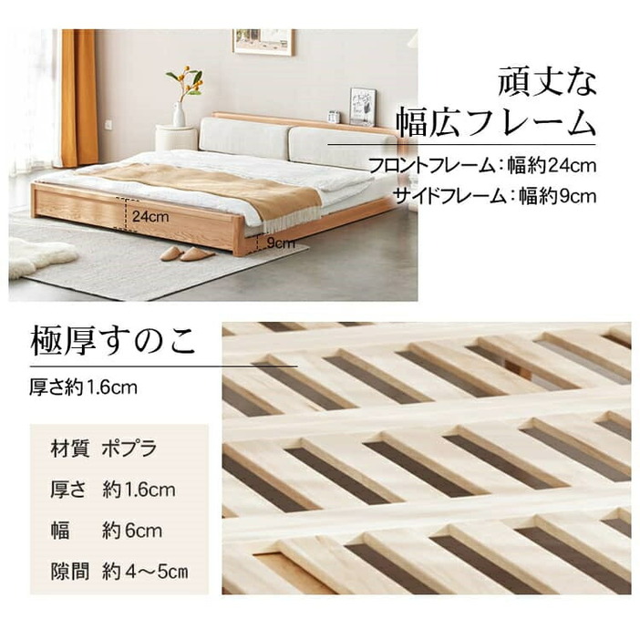 | おすすめのポイント | ■ナチュラル風のベッド、温もりのあるお部屋を演出します。 ■極厚のすのこ構造、耐荷重200KGで、安心・安全に使えます。 ■フレームには通気性・耐久性のあるオーク材を使用されます。 ■実用と美観を両立するヘッドボード、ベッドの上でリラックスした時間を過ごせます。 ■安定感のあるドロップマット構造。 ■通気性に優れたすのこベッド、風を通して年中快適。 |
