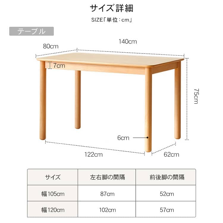 | サイズ | 【テーブル】 ■幅105cm:105cm×70cm×75cm ■幅120cm:120cm×75cm×75cm ■幅140cm:140cm×80cm×75cm 【椅子】 46cm×42cm×80cm |