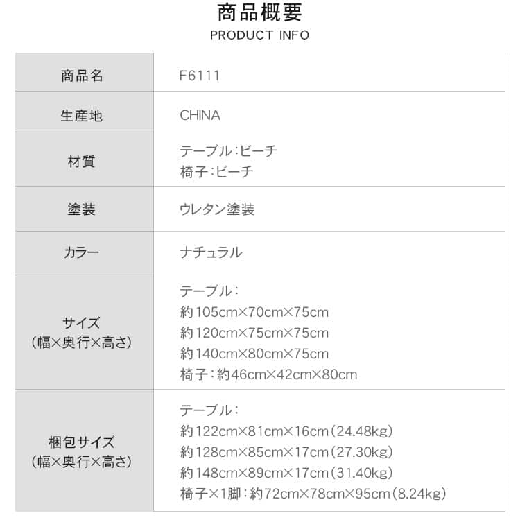 | 梱包重量 | 【テーブル】 ■幅105cm:24.48kg ■幅120cm:27.30kg ■幅140cm:31.40kg 【椅子】 8.24kg |