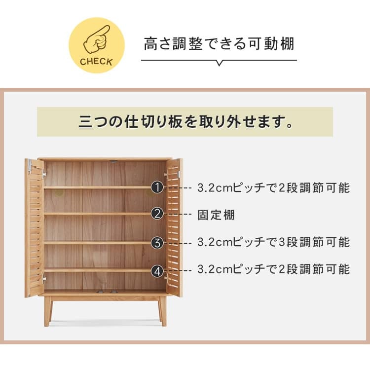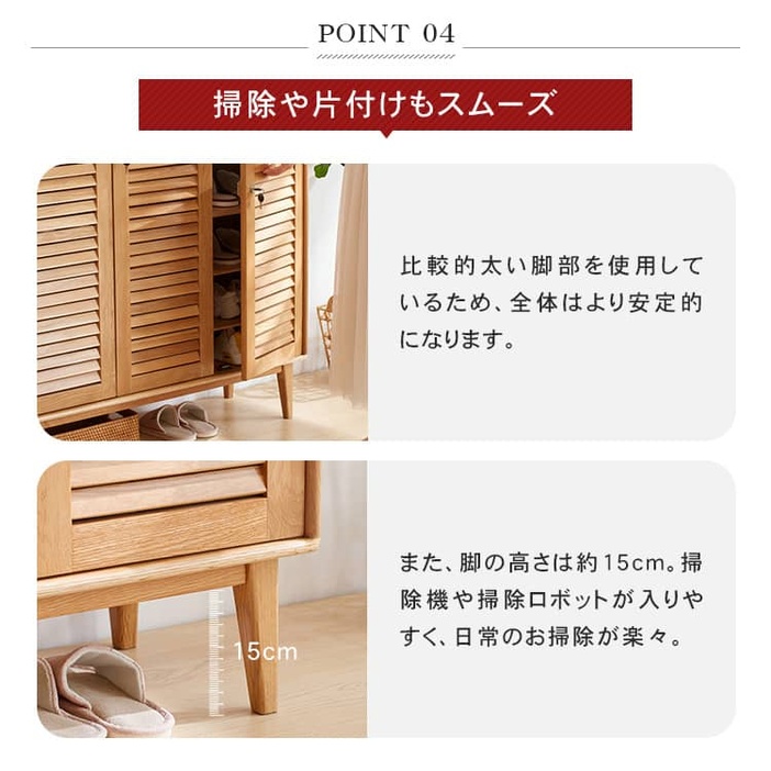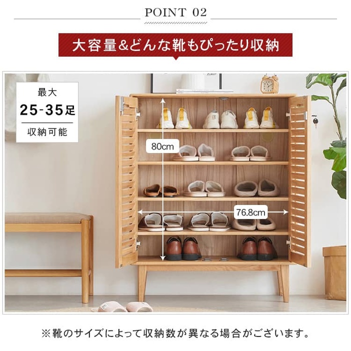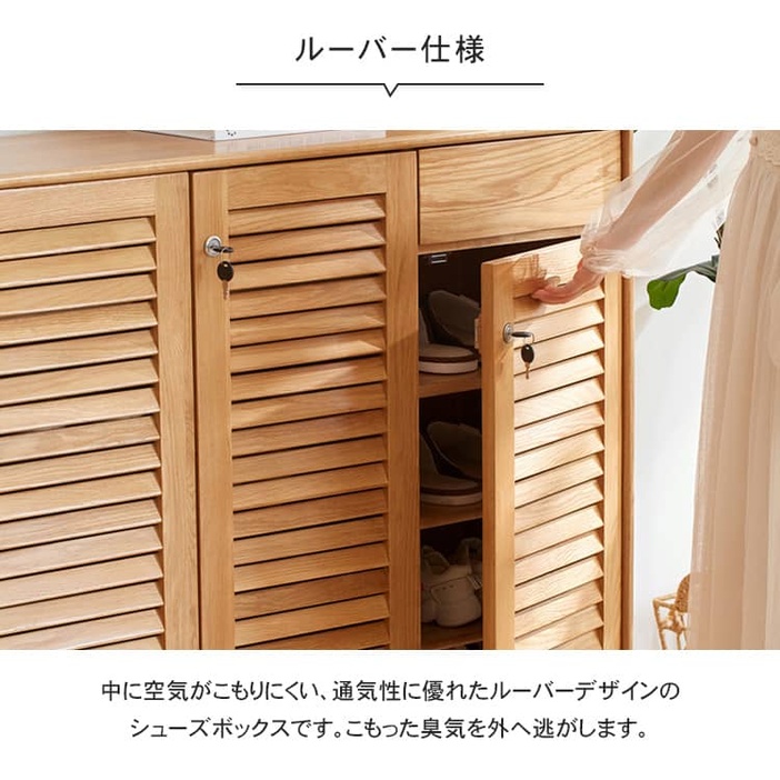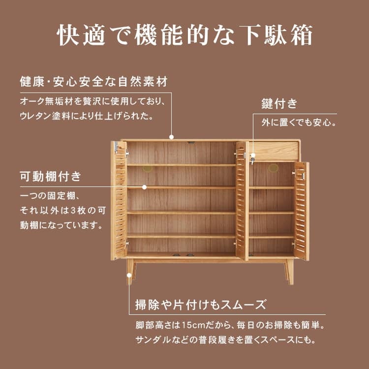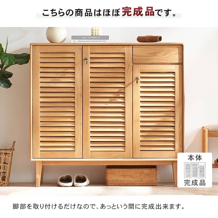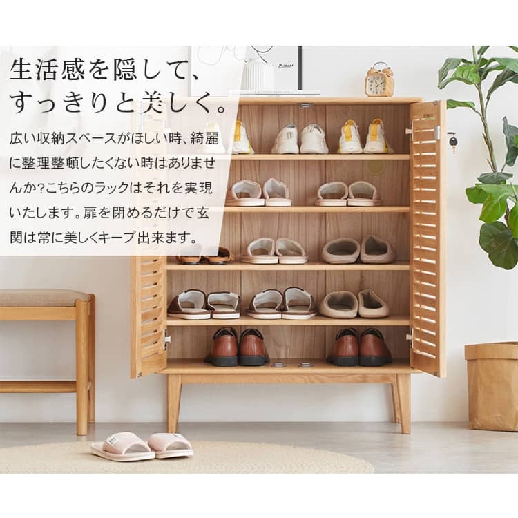 | おすすめのポイント | ■オーク材を贅沢に使用しており、ならではのぬくもり、木目や風合いを楽しむことができます。 ■大容量&どんな靴もぴったり収納できます。最大25~35足収納可能です。 ■三つの仕切り板を取り外せます。 ■可動棚1枚につき、上下約3.2cmの間隔で同じ角度で2段階の高さを調節ができます。 ■転倒防止パーツ付き、家具をしっかり固定して使用できます。 ■角を丸くした安全に配慮した設計で、お子様のいるご家庭でも安心してご使用いただけます。 ■比較的太い脚部を使用して、全体はより安定的になります。 ■足の高さは約12cm。掃除機や掃除ロボットが入りやすく、日常のお掃除が楽々。 ■脚部を取り付けるだけで、あっという間に仕上げます。 ■通気性の高いルーバー式の扉を採用し、湿気や臭いは外に逃がし、新鮮な空気を取り込むデザインに仕上げています。 |