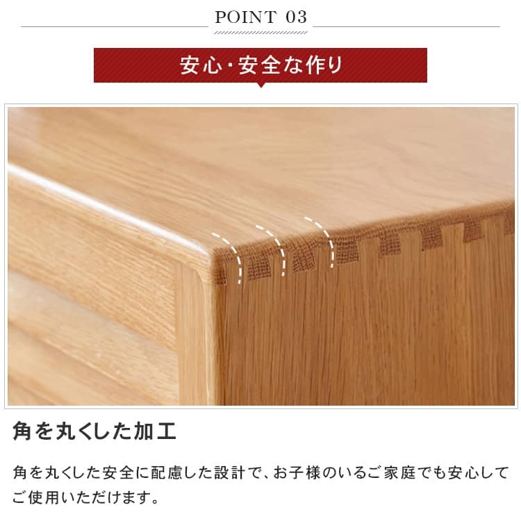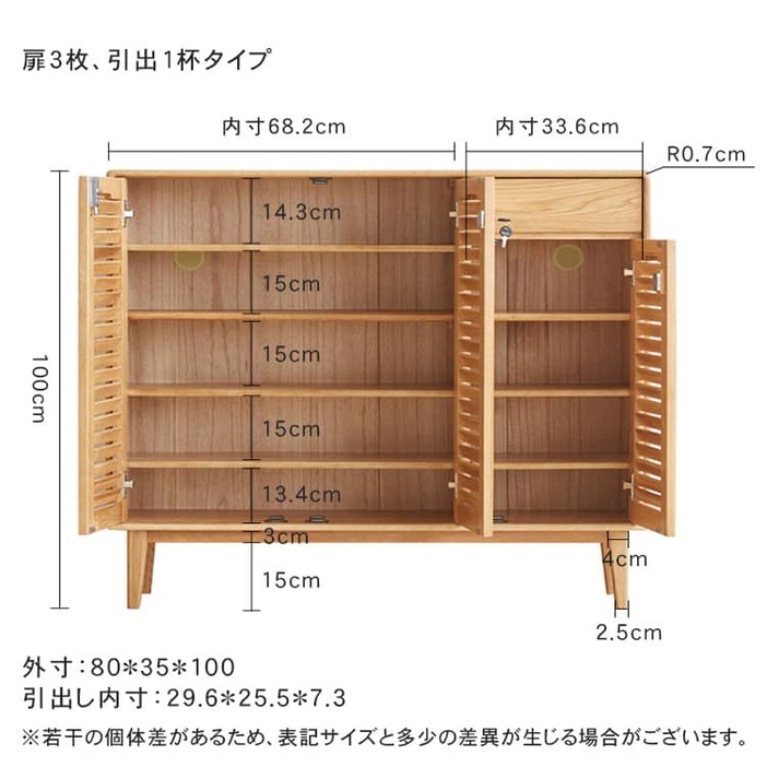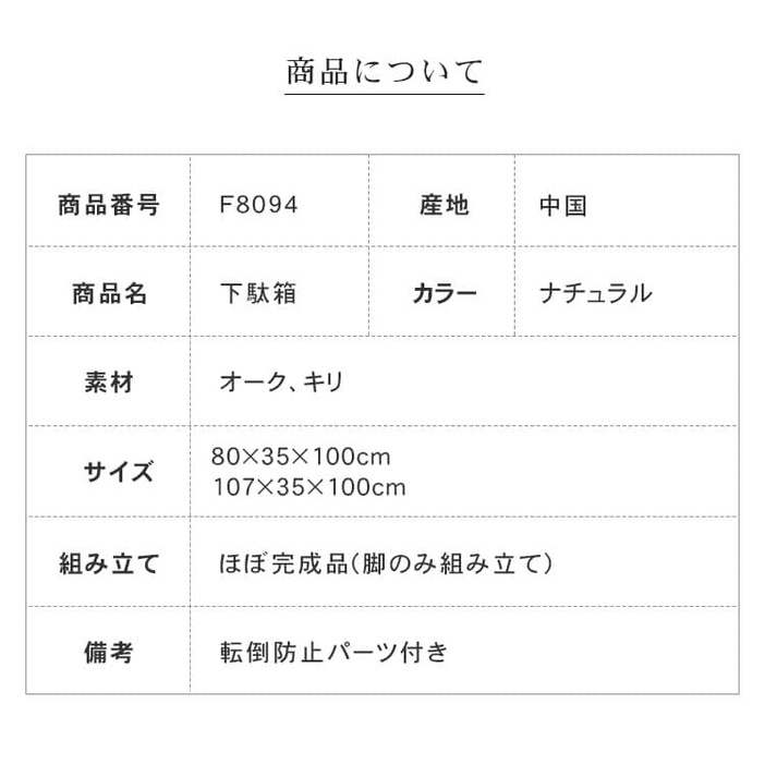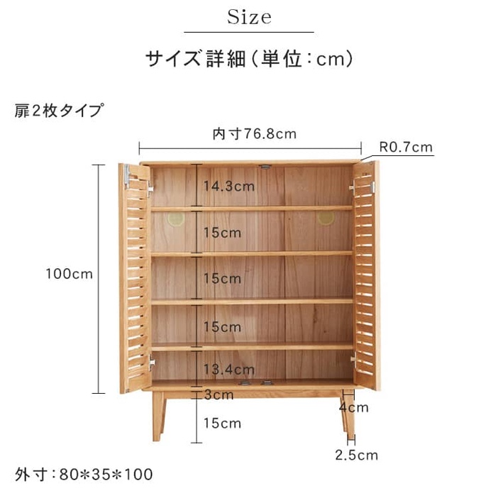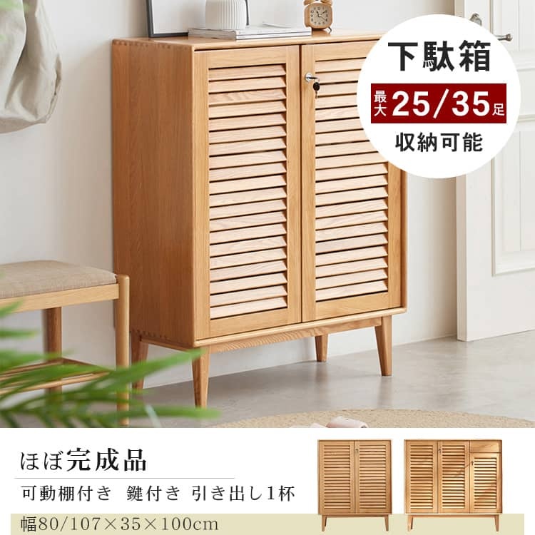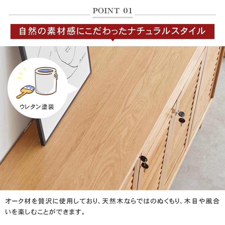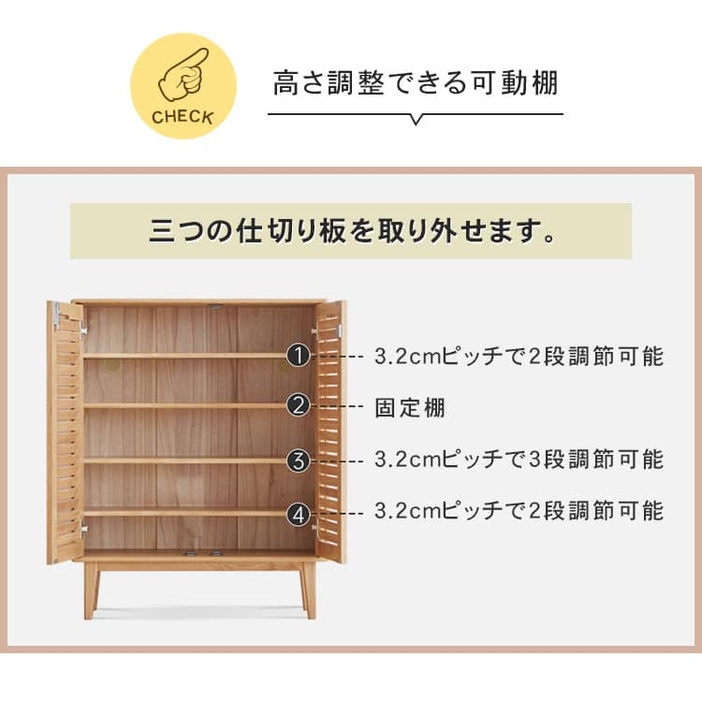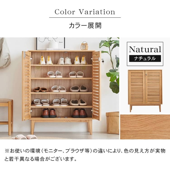 | おすすめのポイント | ■オーク材を贅沢に使用しており、ならではのぬくもり、木目や風合いを楽しむことができます。 ■大容量&どんな靴もぴったり収納できます。最大25~35足収納可能です。 ■三つの仕切り板を取り外せます。 ■可動棚1枚につき、上下約3.2cmの間隔で同じ角度で2段階の高さを調節ができます。 ■転倒防止パーツ付き、家具をしっかり固定して使用できます。 ■角を丸くした安全に配慮した設計で、お子様のいるご家庭でも安心してご使用いただけます。 ■比較的太い脚部を使用して、全体はより安定的になります。 ■足の高さは約12cm。掃除機や掃除ロボットが入りやすく、日常のお掃除が楽々。 ■脚部を取り付けるだけで、あっという間に仕上げます。 ■通気性の高いルーバー式の扉を採用し、湿気や臭いは外に逃がし、新鮮な空気を取り込むデザインに仕上げています。 |