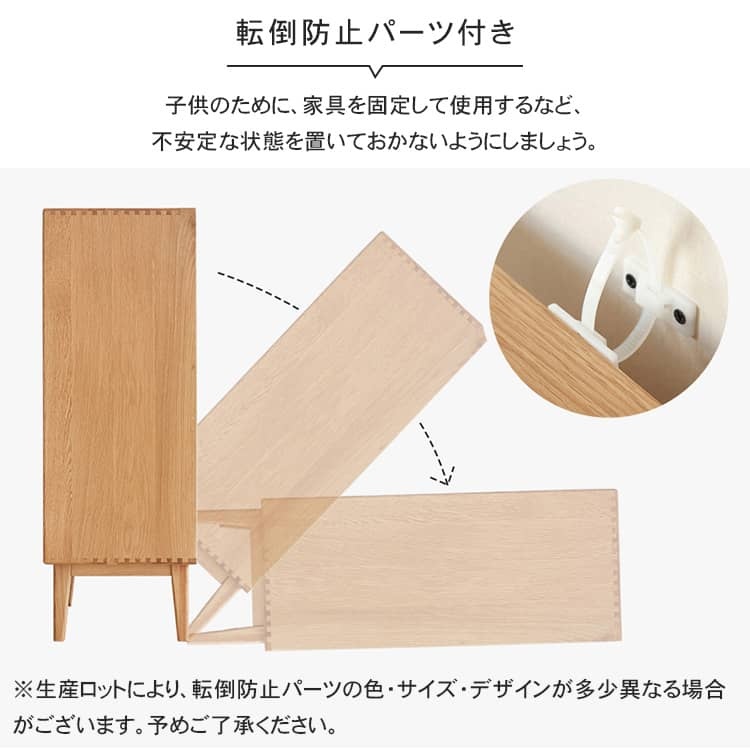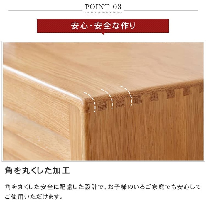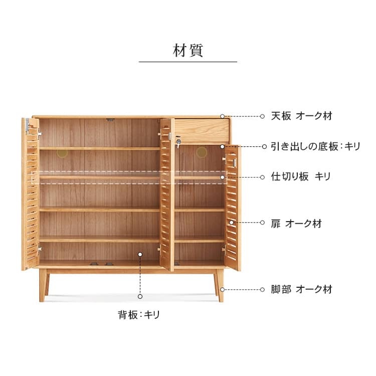 | 素材 | ■天板、扉:オーク材 ■引出しの底板、仕切り板:キリ ■脚部:オーク材 ■背板:キリ |