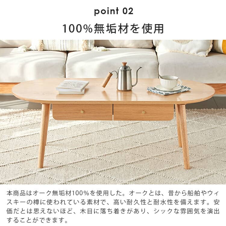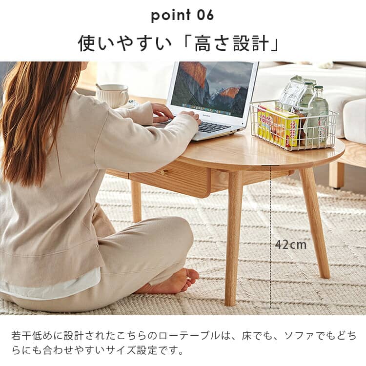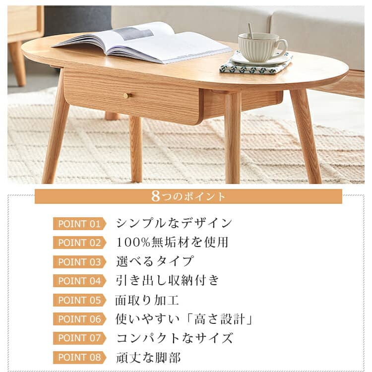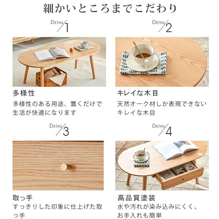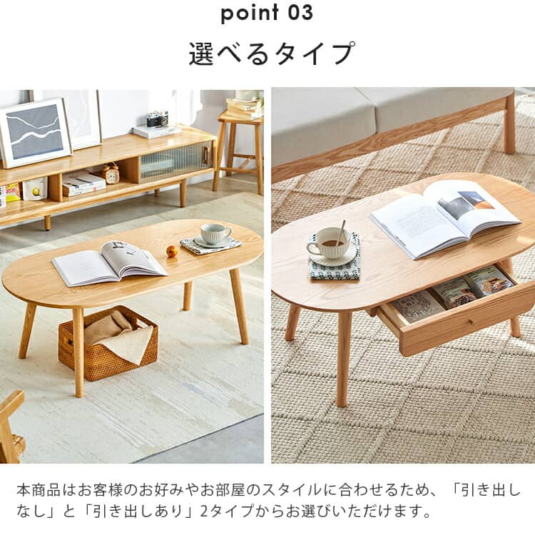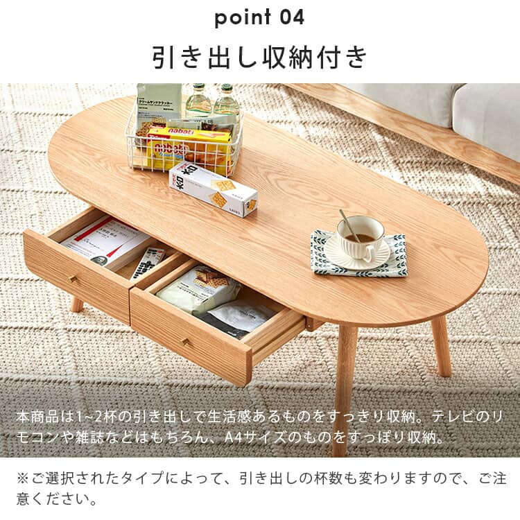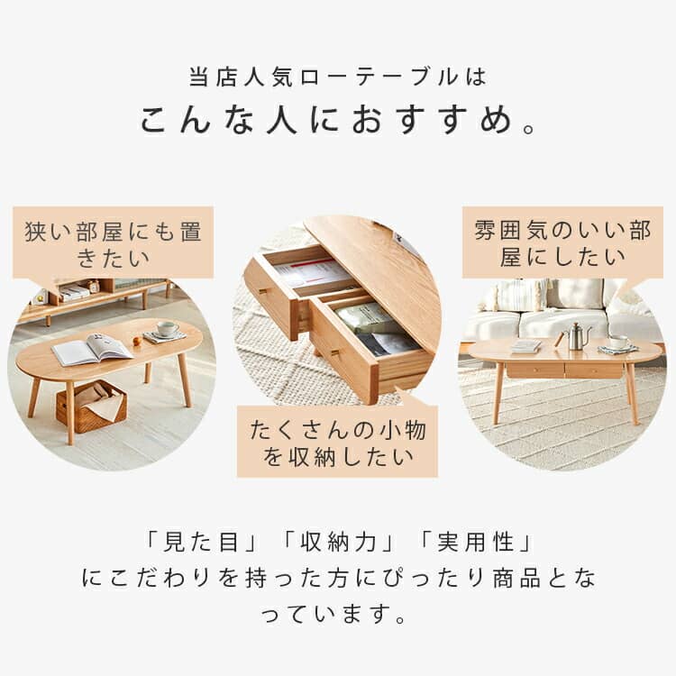 | おすすめのポイント | ■本商品はお客様のお好みやお部屋のスタイルに合わせるため、「引出しなし」と「引き出しあり」2タイプを選びいただけます。 ■ちょっとした収納がほしい場所やワンルームに置いても邪魔にならず、お部屋に馴染むコンパクトなサイズです。 ■見た目、収納力、実用性にこだわりを持った方にぴったり商品となっていなす。 ■1~2杯の引き出しで生活感あるものをすっきり収納。テレビのリモコンや雑誌などはもちろん、A4サイズのものをすっきり収納できます。 ■安定性の高い頑丈な脚、揺れる事なく、安心してご使用いただけます。 ■使いたやすい「高さ設計」若干低めに設計されたローテーブルは、床でも、ソファーでもどちらにも合わせやすいデザイン設定です。 |