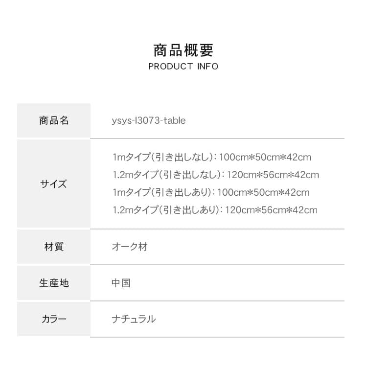 | サイズ | ■1mタイプ(引き出しなし):100cm×50cm×42cm ■1.2mタイプ(引き出しなし):120cm×56cm×42cm ■1mタイプ(引き出しあり):100cm×50cm×42cm ■1.2mタイプ(引き出しあり):120cm×56cm×42cm |