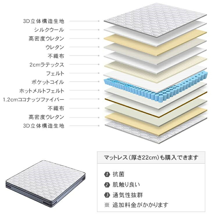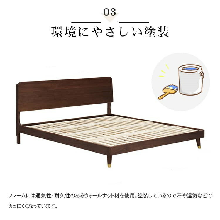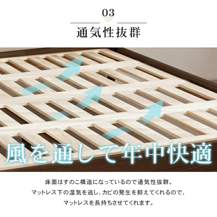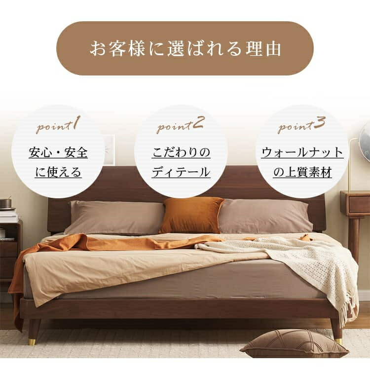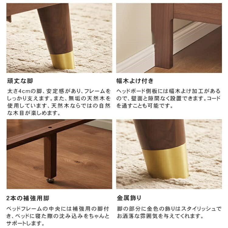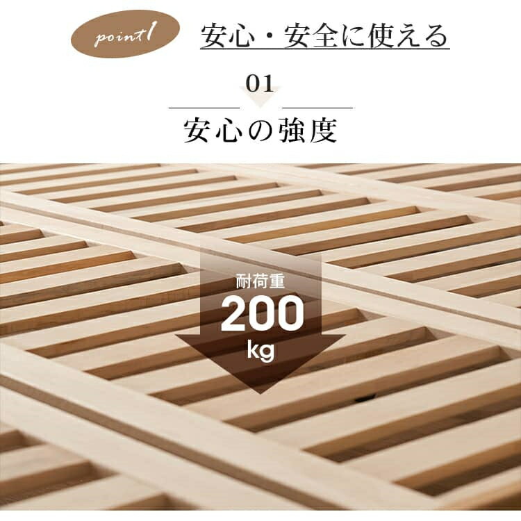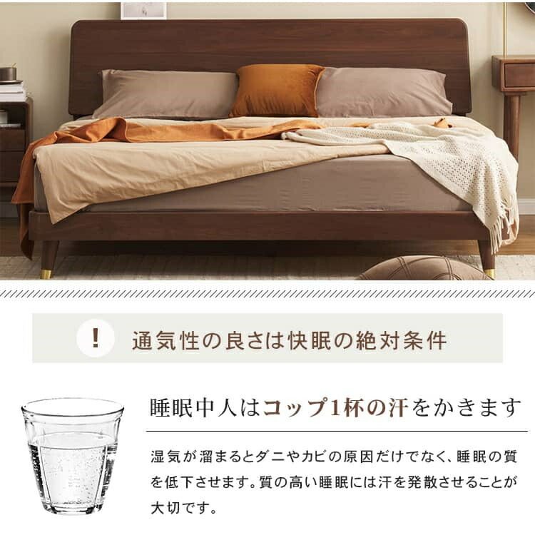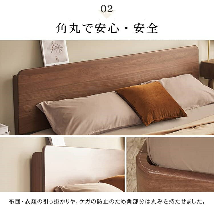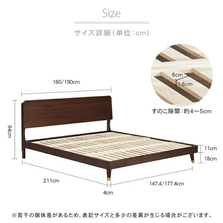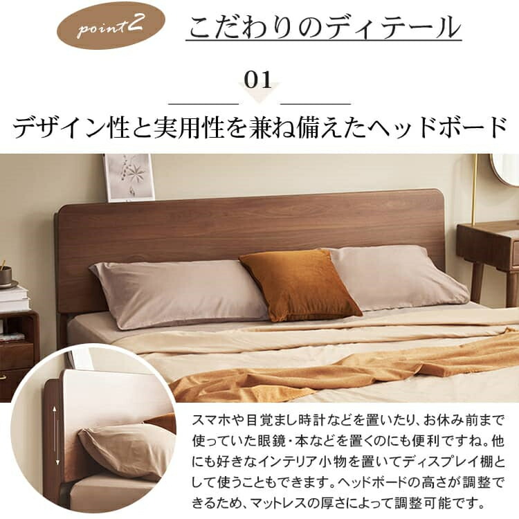 | おすすめのポイント | ■ウールナット材を採用され、木の温かみ感を感じるベッドを作り上げます。 ■極厚のすのこ構造、耐荷重200KGで、安心・安全に使えます。 ■フレームには通気性・耐久性のあるウールナット材を使用されます。 ■デザイン性と実用性を兼ね備えたヘッドボード。 ■地面から18cm離れて、掃除しやすく、収納スペースとしても利用できます。 ■通気性に優れたすのこベッド、風を通して年中快適。 |