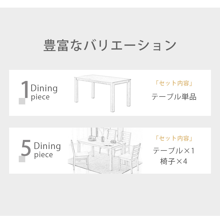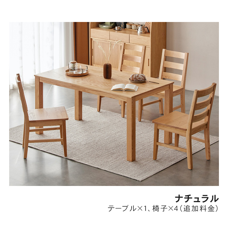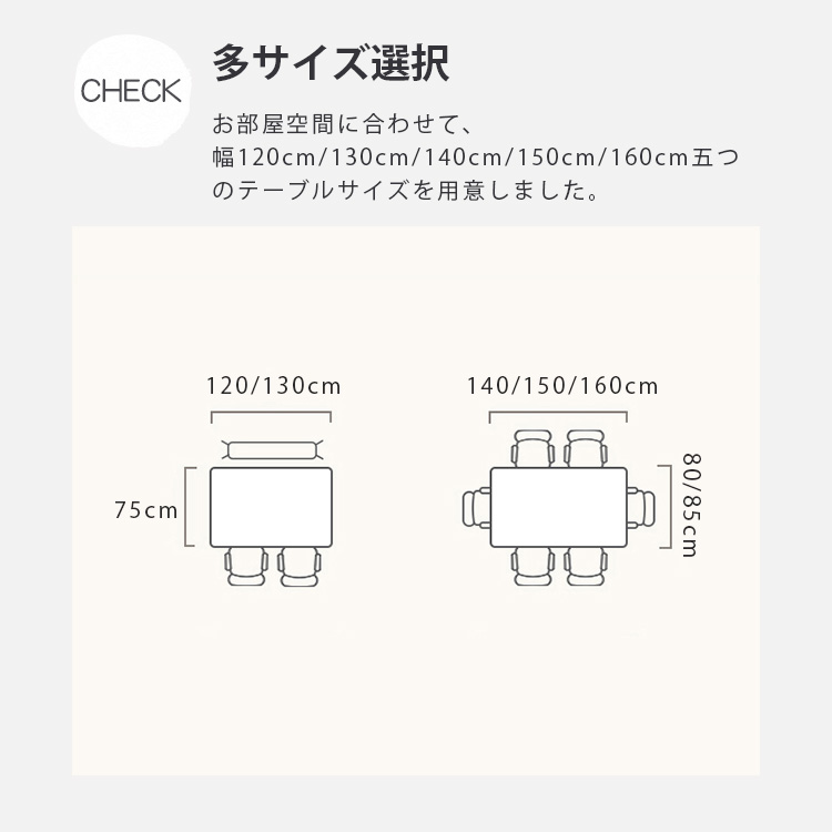 | サイズ | ■幅120cm:120cm×75cm×76cm ■幅130cm:130cm×75cm×76cm ■幅140cm:140cm×80cm×76cm ■幅150cm:150cm×80cm×76cm ■幅160cm:160cm×85cm×76cm 椅子:46.5cm×46.5cm×91cm |