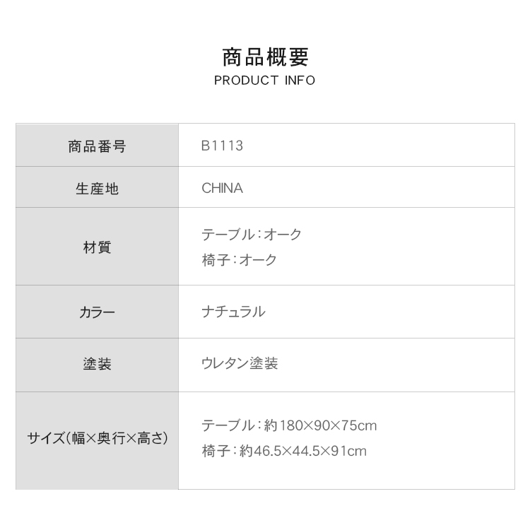 | サイズ | 【テーブル】 約180×90×75cm 【椅子】 約46.5×44.5×91cm |