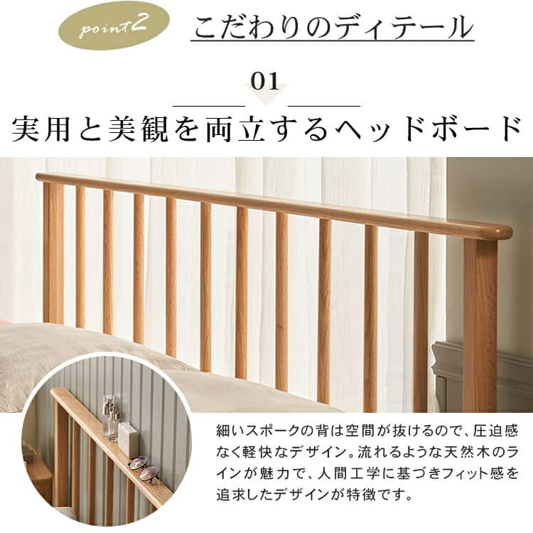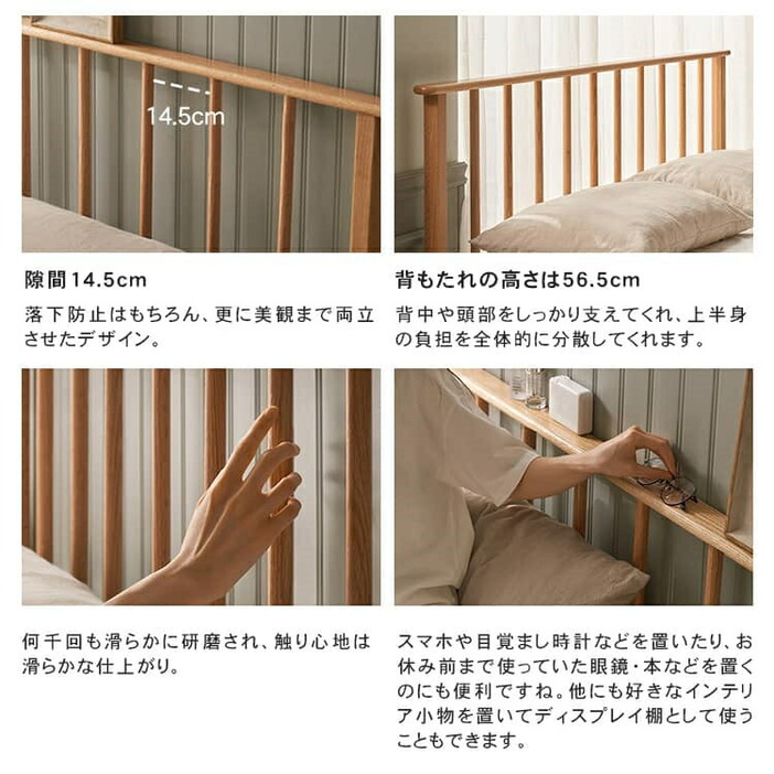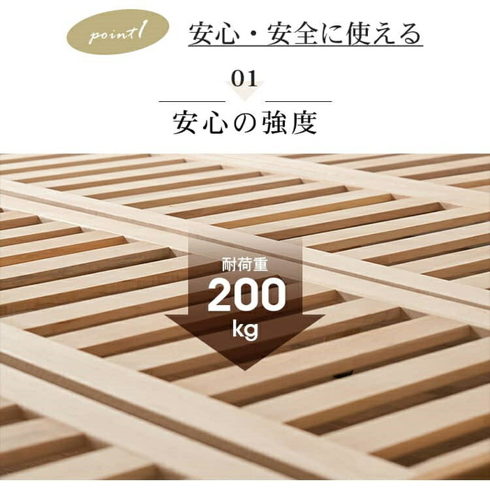 | おすすめのポイント | ■ナチュラル風のベッド、温もりのあるお部屋を演出します。 ■極厚のすのこ構造、耐荷重200KGで、安心・安全に使えます。 ■フレームには通気性・耐久性のあるオーク材を使用されます。 ■実用と美観を両立するヘッドボード、人間工学に基づきフィット感を追求したデザイン。 ■背もたれの高さは56.5cm、背中や頭部をしっかり支え、リラックス時間を過ごせます。 ■地面から17.5cm離れて、お手入れ簡単の上、収納スペースとしても利用できます。 ■通気性に優れたすのこベッド、風を通して年中快適。 |