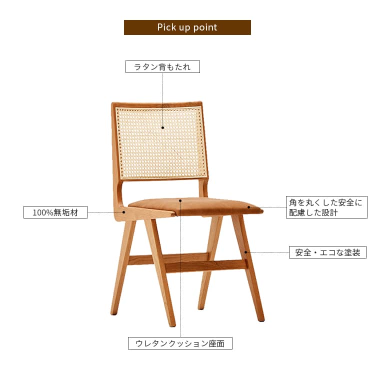 | おすすめのポイント | ■天然素材ならではの温かみを感じられるチェア。 ■ラタンとウッドの自然素材の質感とリラックスしたシルエット、サイズ感が特徴のラウンジチェア。 ■経年変化で風合いを増すチェリー材、柔らかい肌触りが特徴の木材。 ■人間工学に基づいて設計、ゆったり体を預けることができる。 ■やや後方に角度を付けた座面デザイン、自然と体が後ろに倒れ、リラックスできる様に設計した。 ■角を丸くした安全に配慮した設計、お子供のいるご家庭も安心してご使用いただけます。 ■座り心地の良いクッション座面、長時間座っていても疲れにくい。 ■A字型のフレーム、耐久性のある安定した構造、シンプルでスタイリッシュ感を溢れるデザイン。 ■耐荷重は約100kg、安全でしっかり支える設計。 |