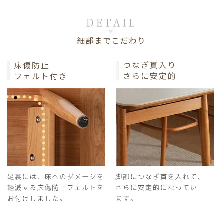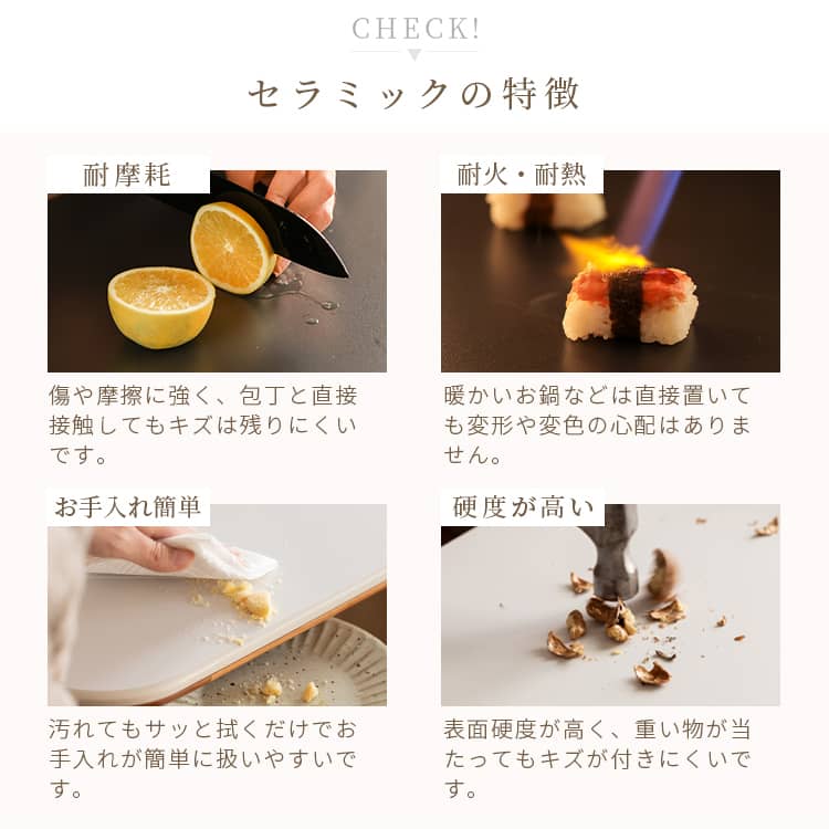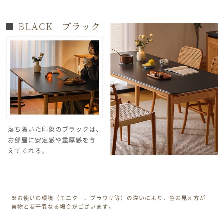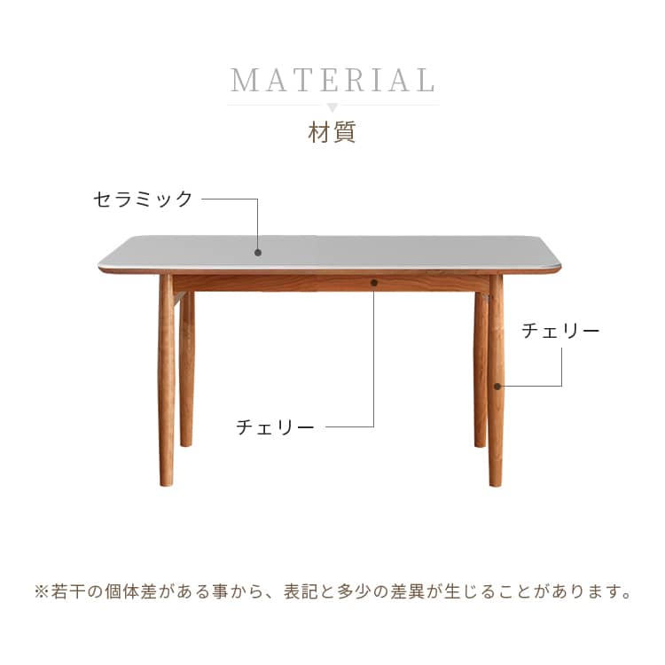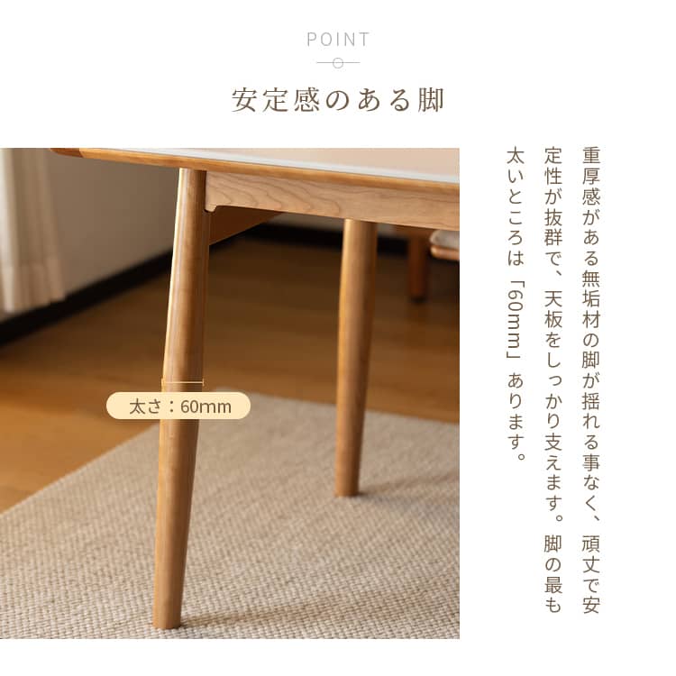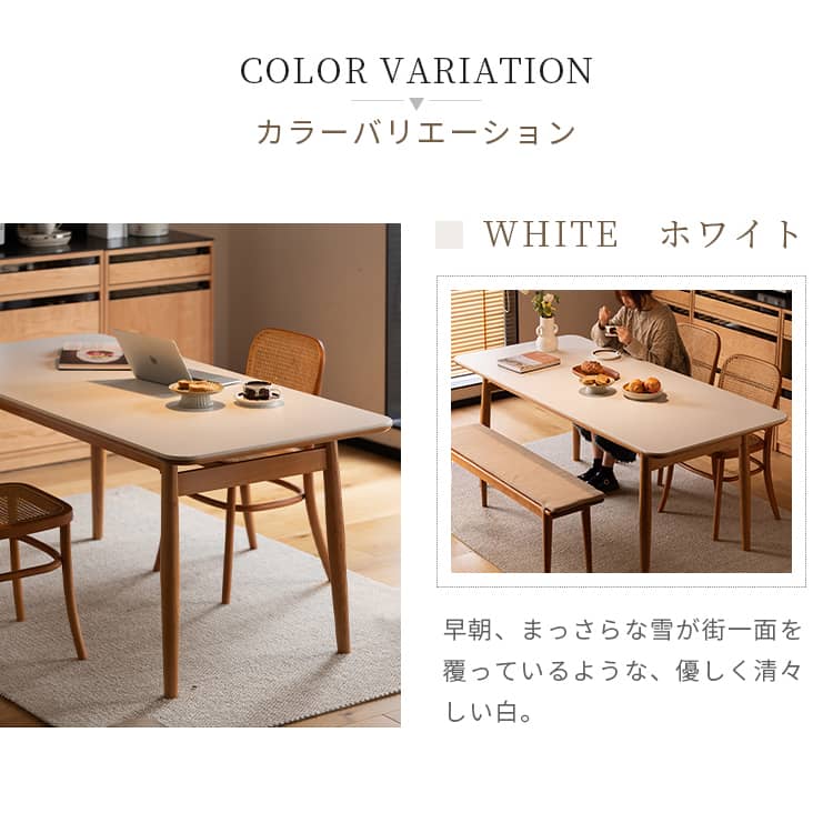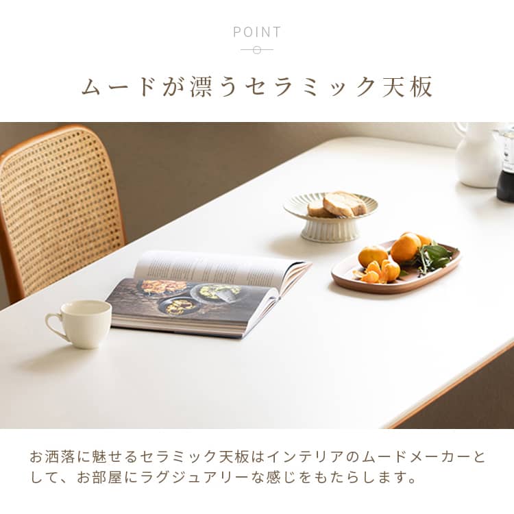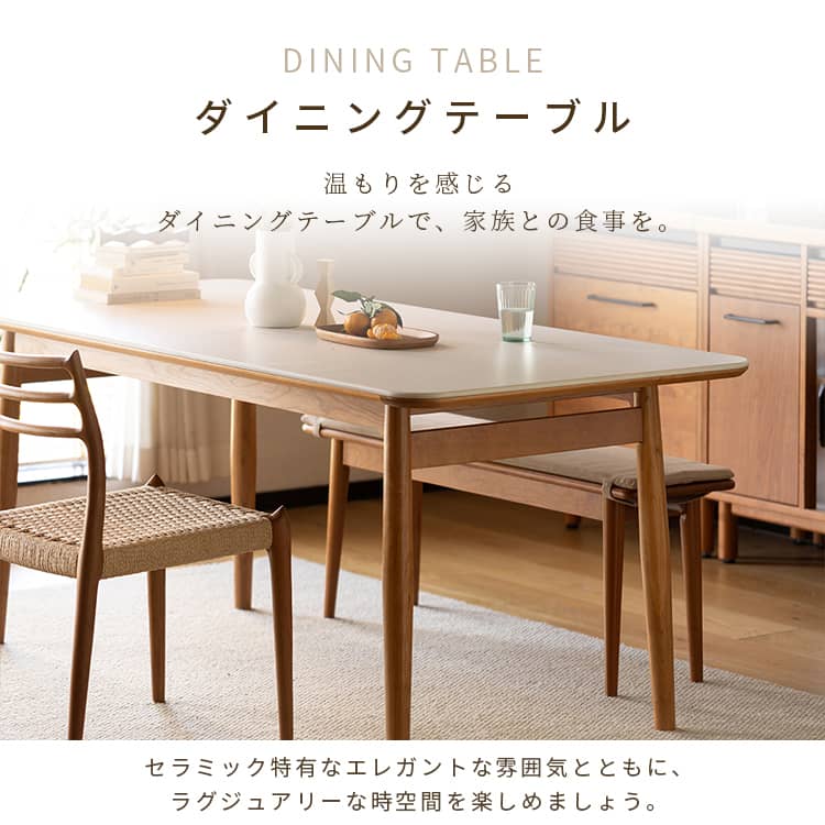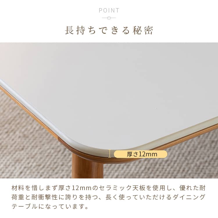 | おすすめのポイント | ■お手入れしやすく、耐熱性に優れたセラミックを採用しました。 ■ダイニングテーブルとしてだけではなく、デスクワークなどにも使いやすいサイズ感です。 ■上品な厚さの天板でありながらも、耐荷重約50kgとしっかりとした作りにこだわりました。 |