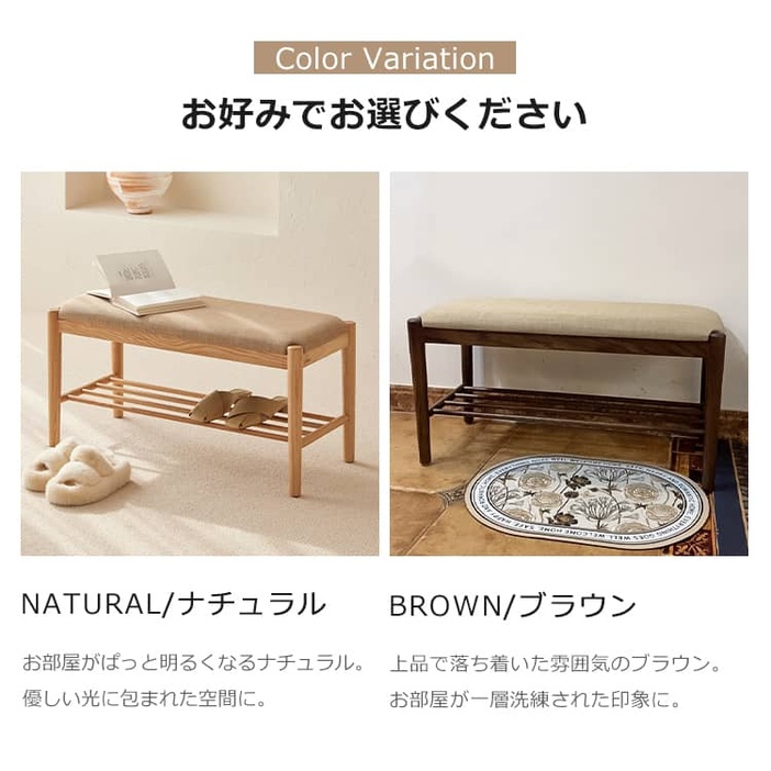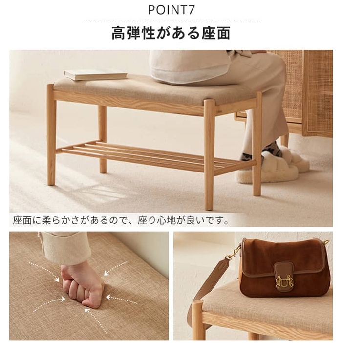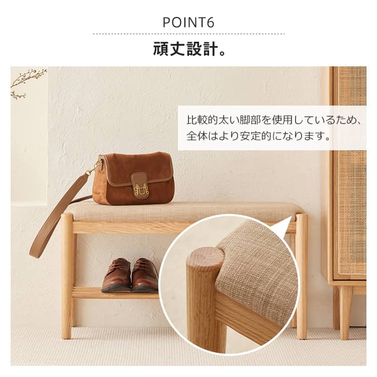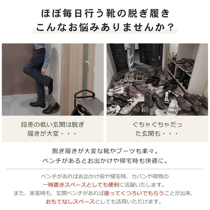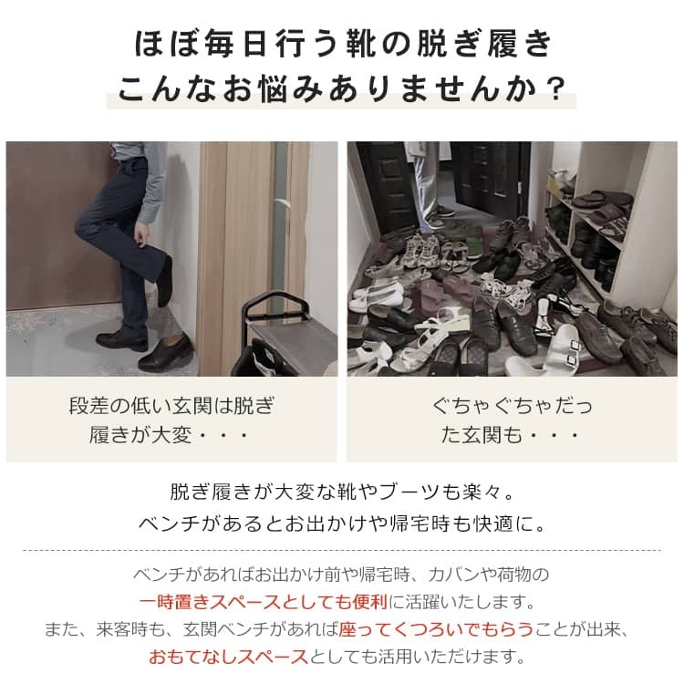 | おすすめのポイント | ■脱ぎ履きが大変な靴やブーツの収納も楽々シューズラック。 ■箱から出してすぐにお使い頂ける。面倒な組み立ては一切不要 ■座面のカバーが綿麻素材を採用され、通気性に抜群。 ■圧迫感を感じにくい開放的なデザイン、明るく清潔感を漂う空間を演出します。 ■ちょうどいい高さ、立ち上がりやすく、膝に負担をかからない。 ■安全・美観した丸加工、安心してご使用いただけます。 ■比較的太い脚を使用しているため、全体はより安定的になります。 ■柔らかい座面、座り心地がよい。 |