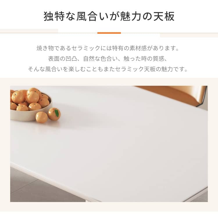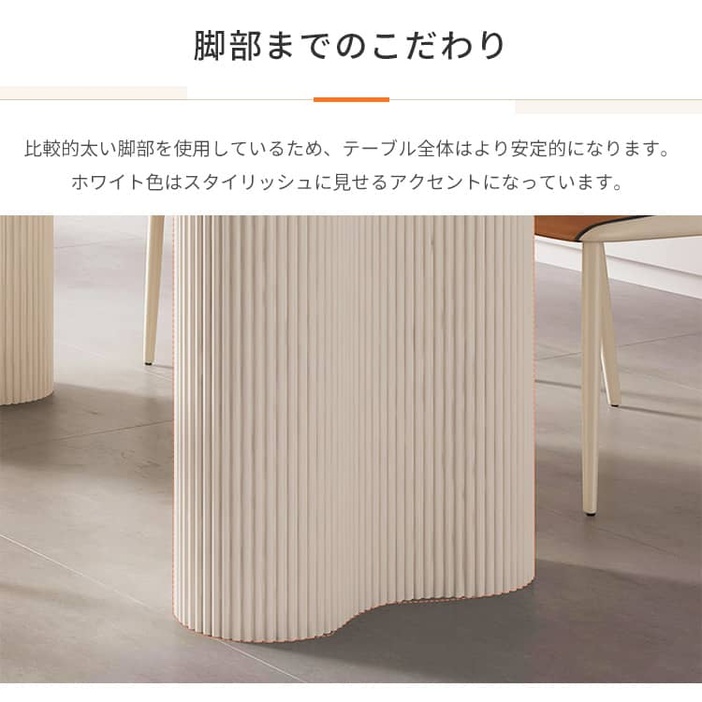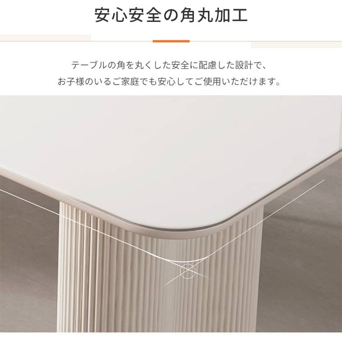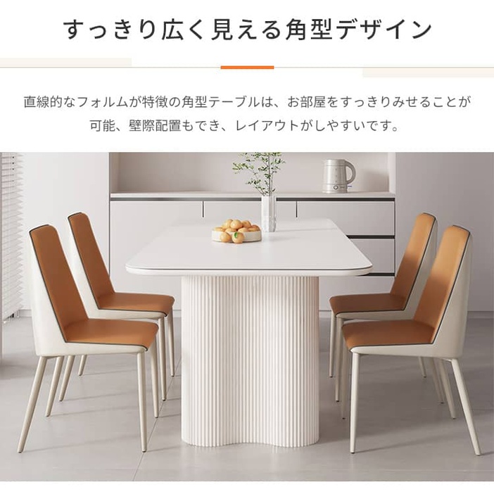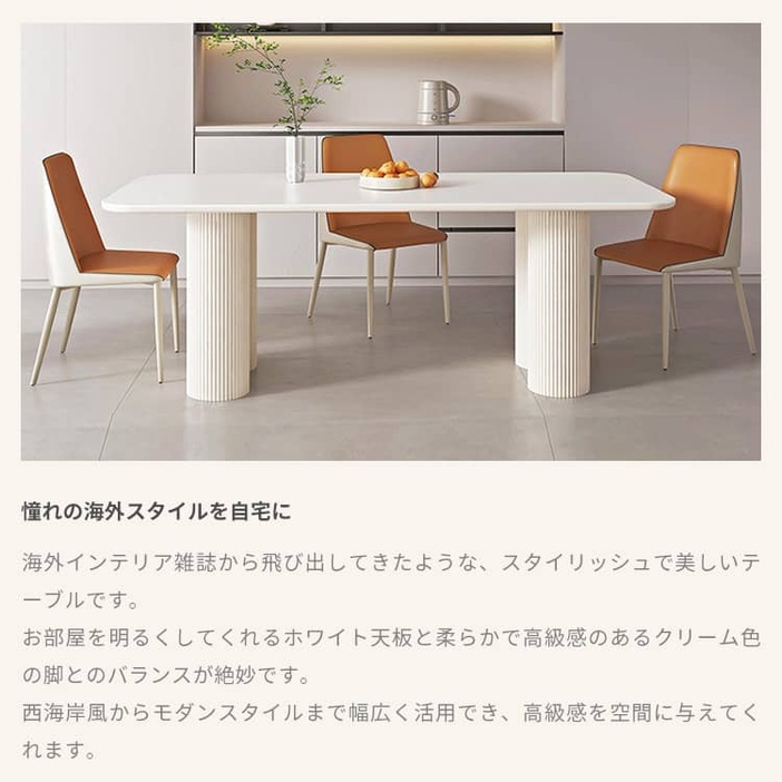 | おすすめのポイント | ■お部屋を明るくしてくれるホワイト天板と柔らかで高級感のあるクリーム色の脚とのバランスが絶妙です。 ■大人4人でもちろん、6人でもゆったり座れる広々としたサイズ感です。 ■スッキリ広く見える角型テーブルはレイアウトがしやすいです。 ■テーブルの耐荷重性が優れているので、安心でご使用いただけます。 ■同シリーズの椅子も一緒にご購入できます。 |